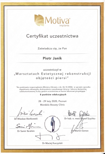 Bardzo polecam Pana Doktora wszystkim, którym zależy na profesjonalnym i jednocześnie bardzo ciepłym, ludzkim podejściu do pacjentów. Dr Janik wyjaśnia bardzo dokładnie na czym polega operacja, jakie metody chirurgiczne zostaną zastosowane i wprost mówi o możliwych komplikacjach, by pacjent mógł podjąć w pełni świadomą decyzję. Przy wyborze implantów całkowicie zaufałam profesjonalnej rekomendacji Doktora Janika i to był strzał w 10. Efekty przeszły moje najśmielsze oczekiwania - dzięki bogatej wiedzy i świetnej technice operacyjnej Pana Doktora. Rekonwalescencja również przebiegała bezproblemowo, a blizny są już niemal niewidoczne.