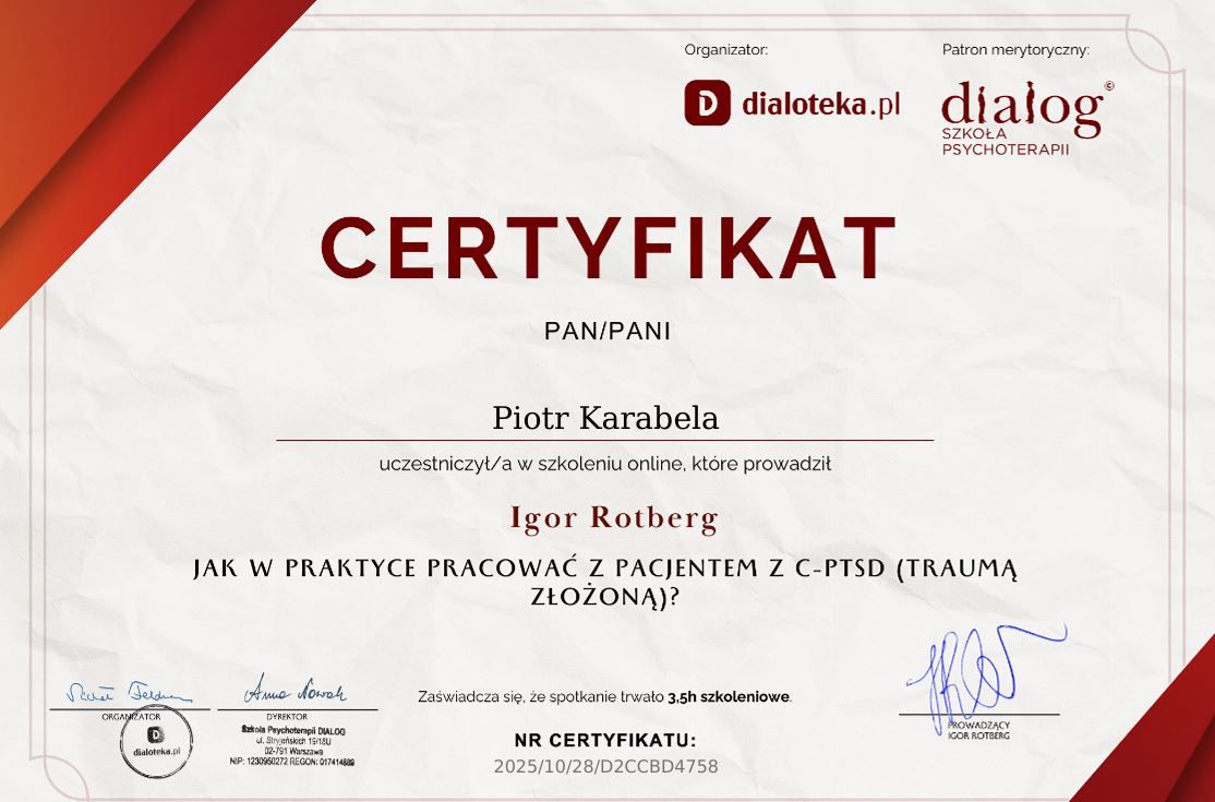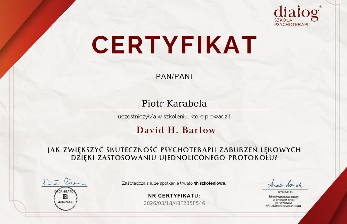 Przez wiele lat pracowałem w dużej korporacji, dlatego dobrze rozumiem tempo, presję i wymagania środowiska biznesowego. Pacjenci często mówią już po pierwszej rozmowie, że wreszcie trafili na kogoś, kto naprawdę zna te realia. Wspieram w radzeniu sobie ze stresem, wypaleniem, perfekcjonizmem, trudnymi relacjami zawodowymi oraz dylematami związanymi z rozwojem kariery lub zmianą pracy.