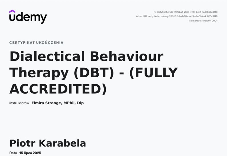 Korzystam z podejścia integracyjnego: elementów DBT, pracy z przekonaniami, uważności i technik regulacji emocji. Zawsze dobieram sposób pracy do konkretnej osoby i jej sytuacji.