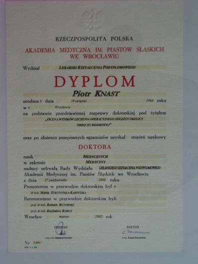 Ukończyłem studia lekarskie na Wrocławskiej Akademii Medycznej w 1989 roku. Swoją przyszłość zawodową postanowiłem związać z chirurgią. Wybór tej dyscypliny medycznej był dla mnie jednocześnie kontynuacją tradycji rodzinnych. W centrum moich zainteresowań znalazła się chirurgia plastyczna. W 1997 roku uzyskałem tytuł specjalisty chirurgii plastycznej, a w 2000 roku tytuł doktora nauk medycznych. Przez 16 lat pracowałem na oddziale chirurgii plastycznej Okręgowego Szpitala Kolejowego we Wrocławiu. Od 1998 roku prowadzę prywatną praktykę. Doświadczenie zdobyte przez ponad 30 lat pracy zawodowej pozwala mi uczciwie i odpowiedzialnie polecać Państwu swoje usługi.