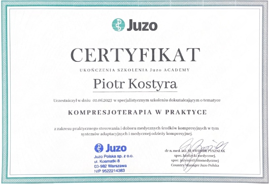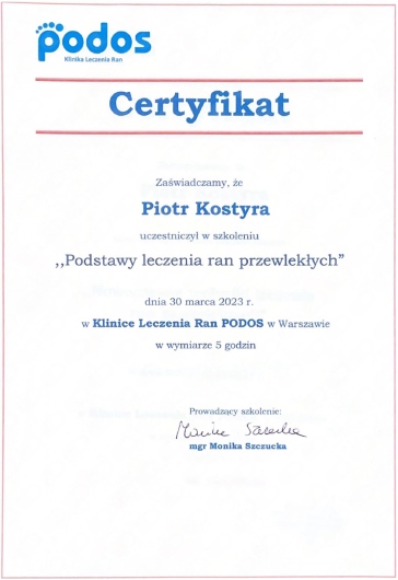 Po 3 latach leczenia owrzodzeń żylnych, różnymi metodami, u wielu specjalistów trafiliśmy do Pana doktora Piotra Kostyry. Od samego początku Pan doktor określił ramy czasowe, oraz sposób postępowania, w tym zalecił dodatkowe badania mające na celu ustalenie przyczyny choroby. Wiedza, profesjonalizm, postęp leczenia z każdą wizytą sprawiały, że rosła nadzieja na pomyślne zakończenie. Po trzech miesiącach od rozpoczęcia leczenia, rany zostały zagojone.Na każdym etapie mogłam liczyć na obszerne wyjaśnienia. Bardzo dziękuję Panu doktorowi i polecam wszystkim którzy mają problemy z ranami.
