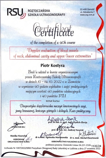 Specjalizuję się w diagnostyce i leczeniu przewlekłej niewydolności żylnej oraz żylaków kończyn dolnych. Stosuję pełne spektrum metod terapeutycznych, obejmujące nowoczesne techniki wewnątrznaczyniowe, takie jak ablacja laserowa EVLT, jak również zaawansowane metody chirurgiczne, w tym miniflebektomię i operacje klasyczne. Leczenie planuję na podstawie szczegółowej diagnostyki ultrasonograficznej oraz zgodnie z aktualnymi europejskimi i światowymi standardami postępowania.