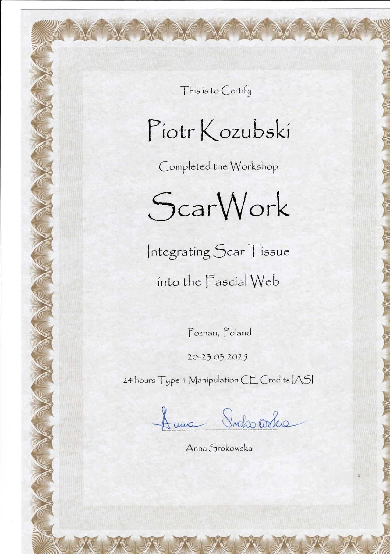 Metoda ScarWork to specjalistyczna forma terapii blizn, ukierunkowana na poprawę elastyczności tkanek, redukcję dolegliwości bólowych oraz przywracanie prawidłowej funkcji obszaru objętego blizną. Terapia znajduje zastosowanie u pacjentów z bliznami pooperacyjnymi, pourazowymi, po oparzeniach, cesarskim cięciu oraz innych zabiegach chirurgicznych.