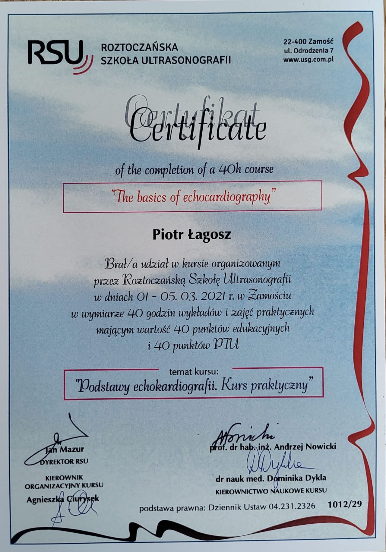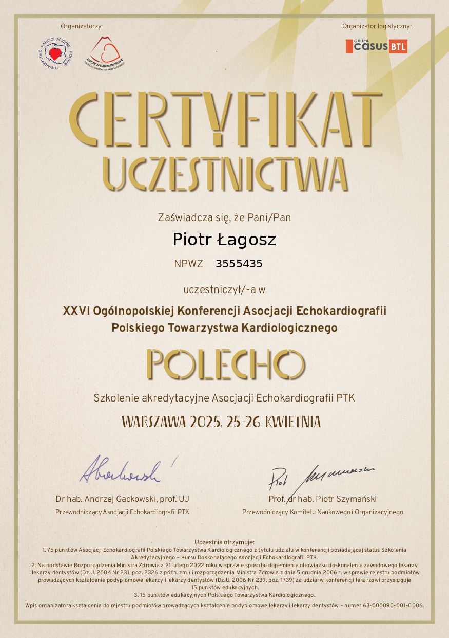 Jaki jest zakres porad oferowanych przez Piotr Łagosz?Piotr Łagosz to w trakcie specjalizacji (kardiolog). Na podstawie swojego doświadczenia i wykształcenia Piotr Łagosz oferuje usługi takie jak: konsultacja kardiologiczna, konsultacja kardiologiczna + EKG, ECHO serca, konsultacja kardiologiczna + EKG + ECHO serca, Konsultacja kardiologiczna + EKG + Holter EKG, konsultacja kardiologiczna + EKG + echo serca + Holter EKG, Konsultacja kardiologiczna + EKG + Holter ciśnieniowy, Konsultacja kardiologiczna + EKG + Holter Ciśnieniowy + Holter EKG.