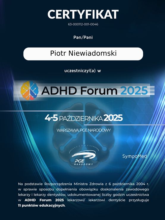 Podczas wstępnego wywiadu, który przeprowadził ze mną Pan Piotr w ramach diagnozy mojego syna w kierunku ADHD, wykazał się wysokim profesjonalizmem. Jego podejście było konkretne, rzeczowe i ukierunkowane na uzyskanie najważniejszych informacji. Rozmowa przebiegła w sposób klarowny i uporządkowany, co pozwoliło mi poczuć, że sprawa jest prowadzona w sposób kompetentny i odpowiedzialny.Serdecznie polecam.