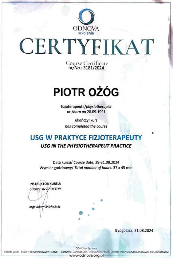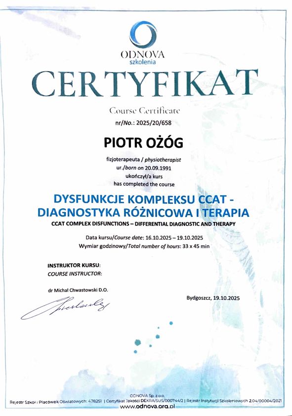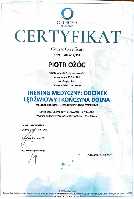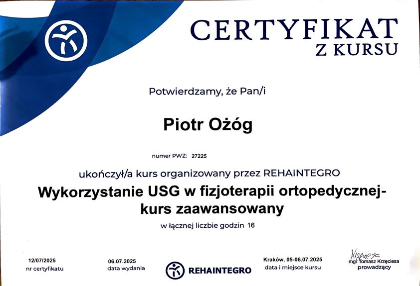 dr n. med. i n. o zdr. Piotr Ożóg - Fizjoterapeuta, Terapeuta Manualny, Terapeuta Integracji Strukturalnej ATSI. Nauczyciel akademicki - adiunkt w Katedrze Fizjoterapii Collegium Medicum UMK w Bydgoszczy.