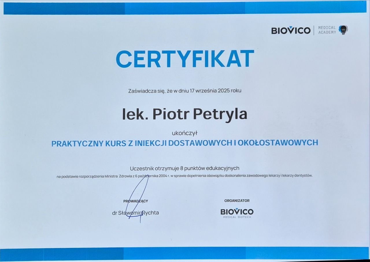 Prowadzę diagnostykę i leczenie, wykorzystując badanie USG oraz iniekcje dostawowe i okołostawowe, które często pozwalają uniknąć bardziej inwazyjnych metod.