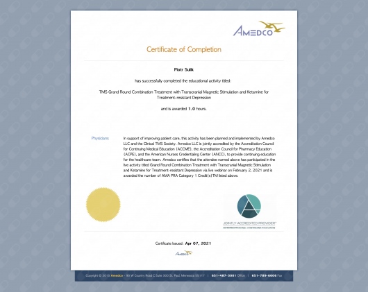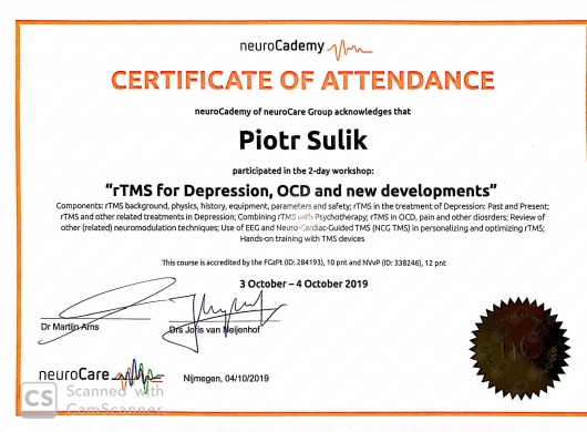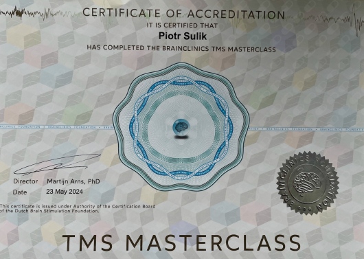 Jestem psychiatrą z ponad dwudziestoletnim doświadczeniem. Specjalizuję się w leczeniu najtrudniejszych przypadków za pomocą nieinwazyjnych metod stymulacji mózgu (NIBS) do jakich należy m.in. TMS (przezczaszkowa stymulacja magnetyczna) oraz TPS (przezczaszkowa stymulacja impulsowa). Obydwie metody wykorzystuję od 2019r. w codziennej praktyce lekarskiej u pacjentów lekoopornych lub źle znoszących farmakoterapię.