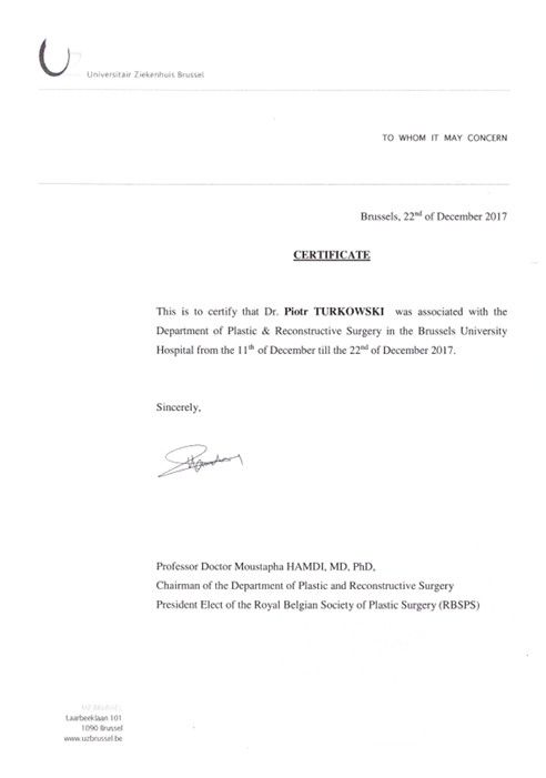 Doświadczenie zdobywał również za granicą, uczestnicząc w licznych stażach i szkoleniach. Odbył indywidualny staż u dr. Russella Knudsena w Sydney, gdzie doskonalił techniki przeszczepu włosów FUE i FUT, a także pracował w Akademikliniken w Sztokholmie – największej prywatnej klinice chirurgii plastycznej w Szwecji. Szkolił się również w Ameryce Południowej u takich specjalistów jak Humberto Uribe Morelli, Hector Duran czy Alejandro Echaury. W zakresie operacji piersi doskonalił się pod kierunkiem prof. Moustapha Hamdiego oraz Paolo Montemurro. Jest członkiem międzynarodowej organizacji International Society of Hair Restoration Surgery (ISHRS), zrzeszającej lekarzy zajmujących się chirurgią odtwórczą włosów.