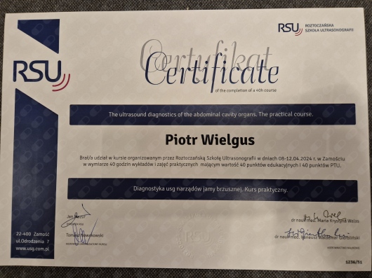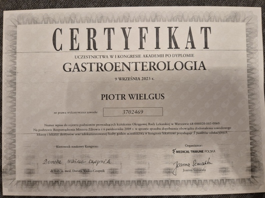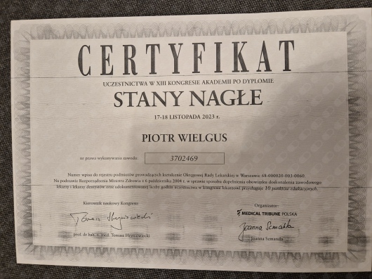 Stale podnoszę swoje kwalifikacje zawodowe, biorąc czynny udział w kongresach naukowych, kursach i stażach w Polsce i za granicą.