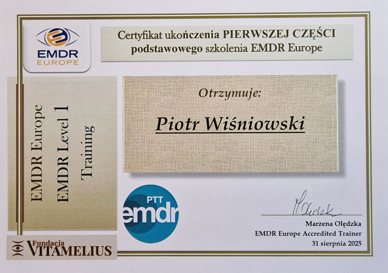 Nazywam się Piotr Wiśniowski, jestem psychologiem, psychotraumatologiem (absolwentem Psychotraumatologii na Uniwersytecie SWPS) oraz terapeutą EMDR. Pomagam osobom zmagającym się z lękiem, napięciem, problemami w relacjach czy obniżonym nastrojem, a także tym, które czują potrzebę zrozumienia i uporządkowania swojej historii. Pracuję również z konsekwencjami traumatycznych doświadczeń, które mimo upływu czasu wciąż wpływają na przeżywanie siebie i relacje z innymi.