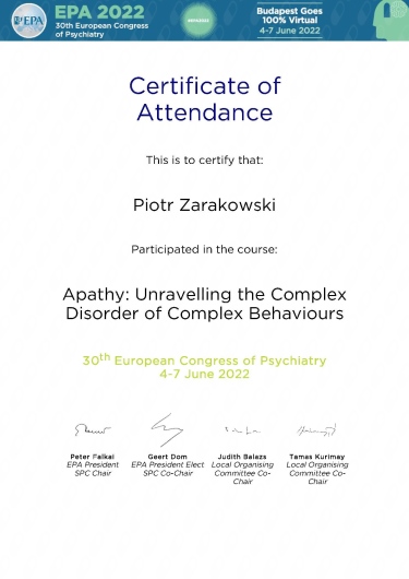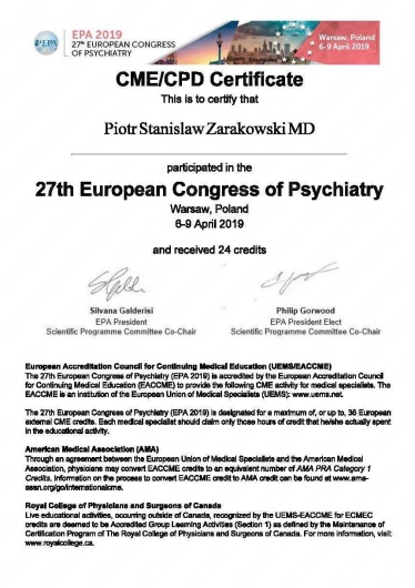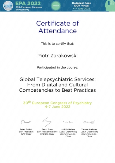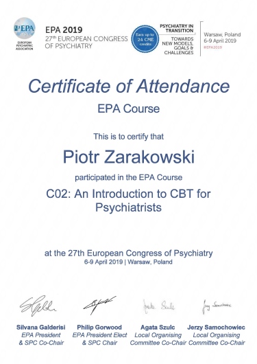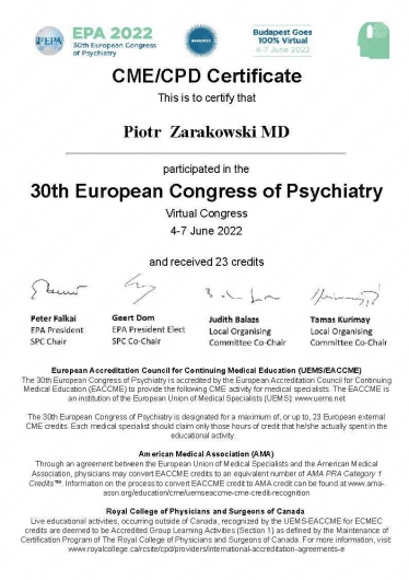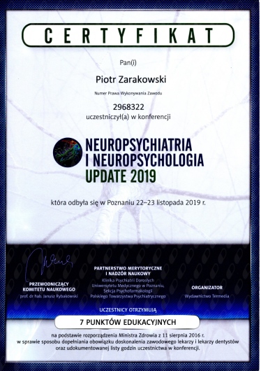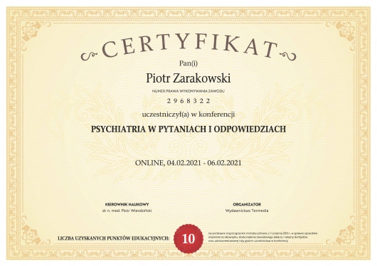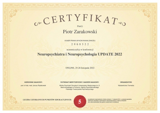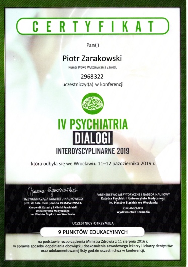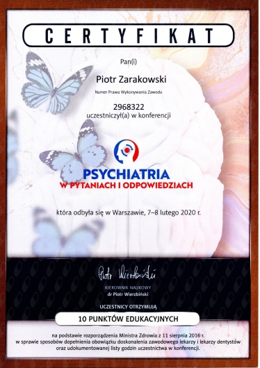 Jestem specjalistą psychiatrii. Posiadam doświadczenie zarówno w lecznictwie szpitalnym, jak i ambulatoryjnym. Jestem członkiem Polskiego Towarzystwa Psychiatrii. Nieustannie poszerzam i uaktualniam swoją wiedzę, uczestnicząc w konferencjach naukowych i szkoleniach.