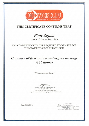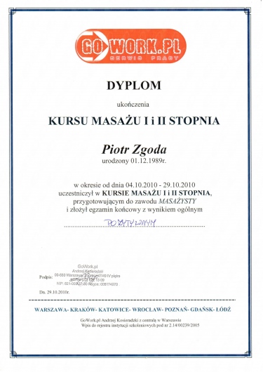 Jaki jest zakres porad oferowanych przez Piotr Zgoda?Piotr Zgoda to fizjoterapeuta. Na podstawie swojego doświadczenia i wykształcenia Piotr Zgoda oferuje usługi takie jak: konsultacja fizjoterapeutyczna, Terapia manualna, masaż klasyczny, fizykoterapia, jonoforeza, ultradźwięki, magnetoterapia, Laseroterapia, taping (plastrowanie), elektroterapia.