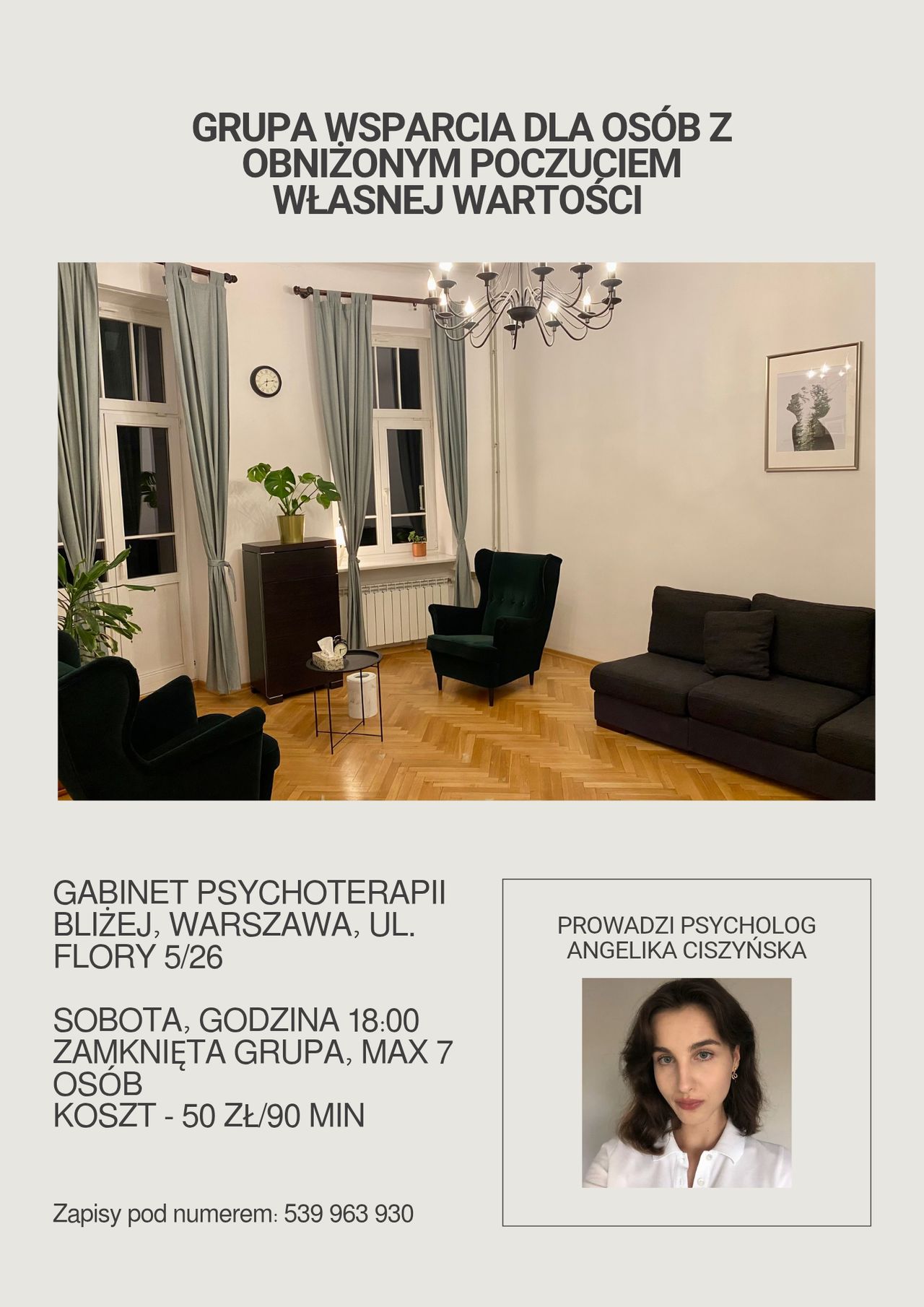 Zapraszamy do udziału w grupie wsparcia prowadzonej przez psychologa, który wspiera na co dzień osoby borykające się z obniżonym poczuciem własnej wartości w gabinecie. To bezpieczna przestrzeń, w której uczestnicy będą dzielić się swoimi doświadczeniami bez oceny. Celem spotkań jest zrozumienie własnych przekonań na temat samego siebie i nauka innych, bardziej sprzyjających. Nie jesteś z tym sam/sama, możesz sięgnąć po wsparcie.