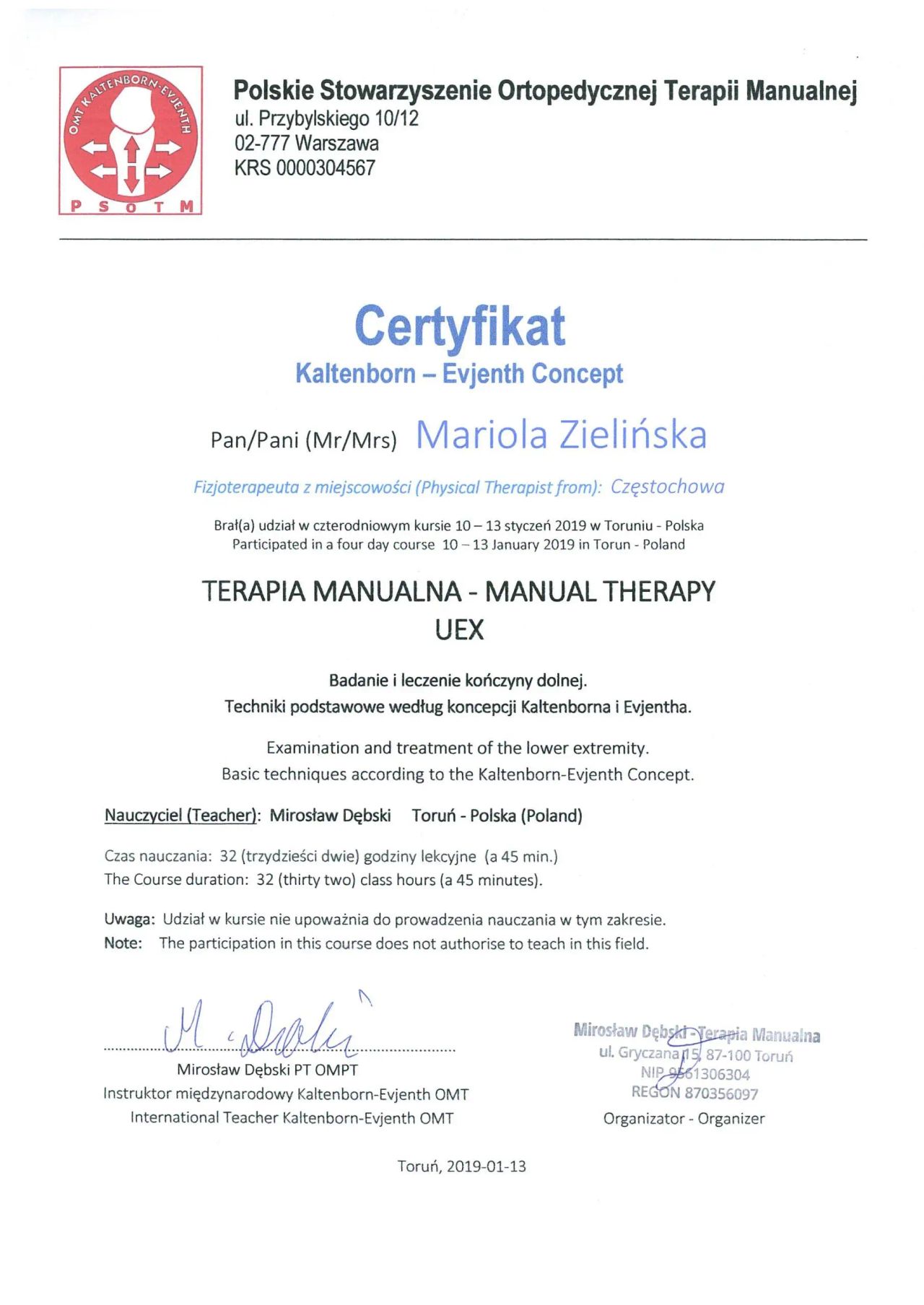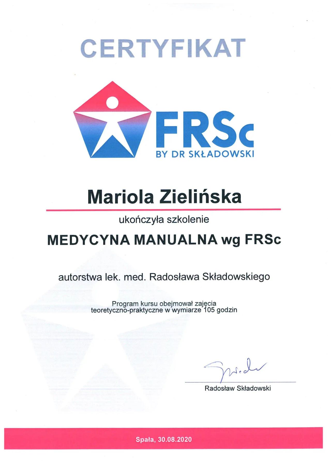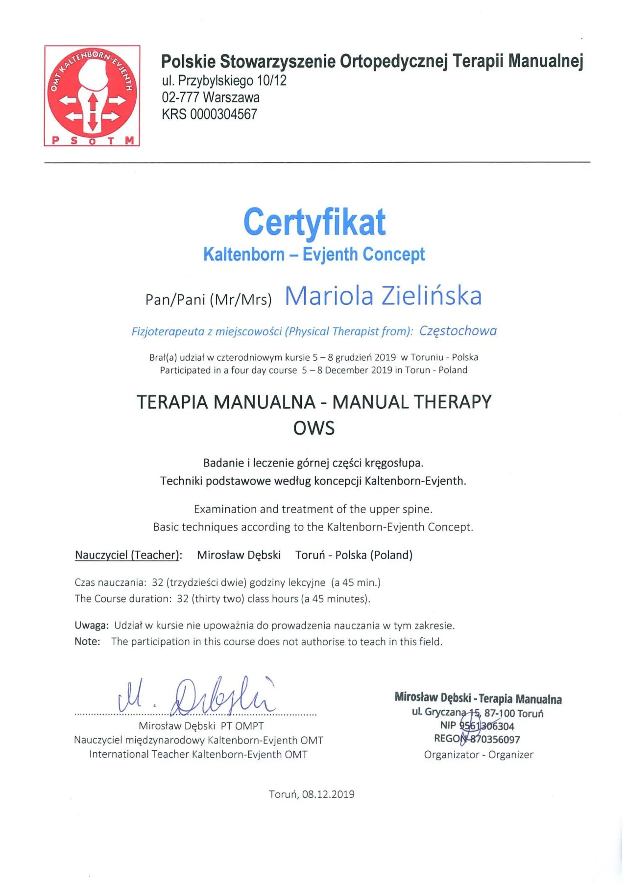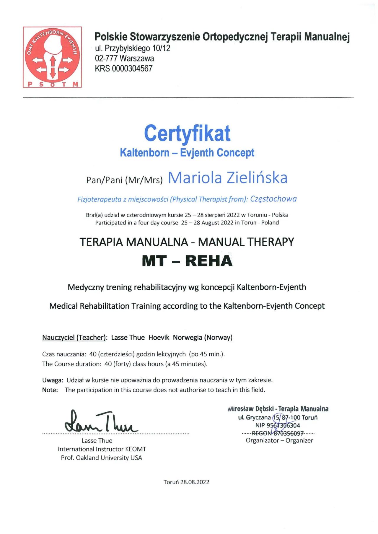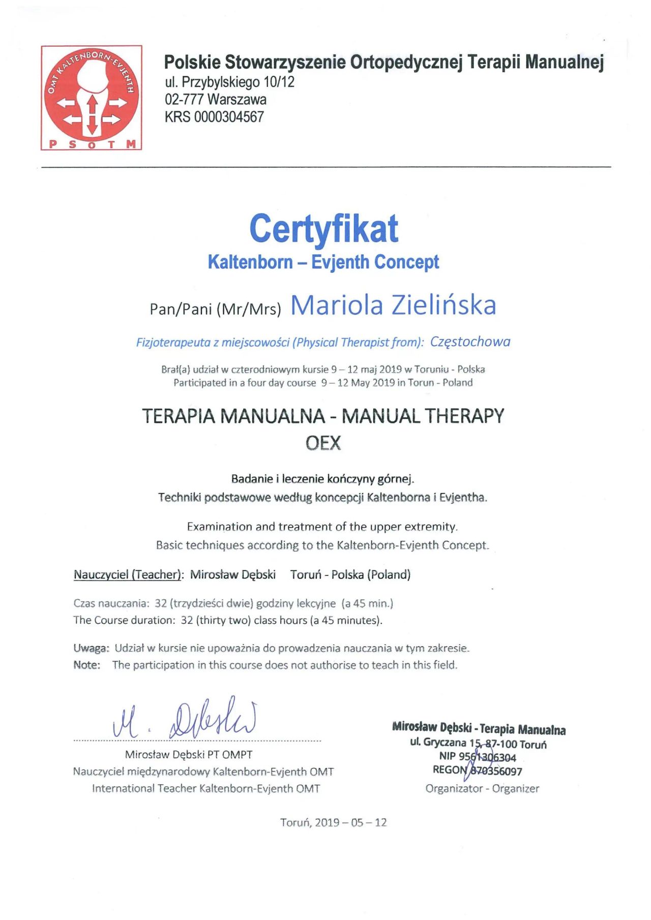Pani Mariola Zielińska wyleczyła mój bark. Z empatią i zaangażowaniem zastosowała skuteczne metody leczenia. Wyjaśniła przyczyny bólu i niesprawności barku, dała zalecenia. Dziękuję