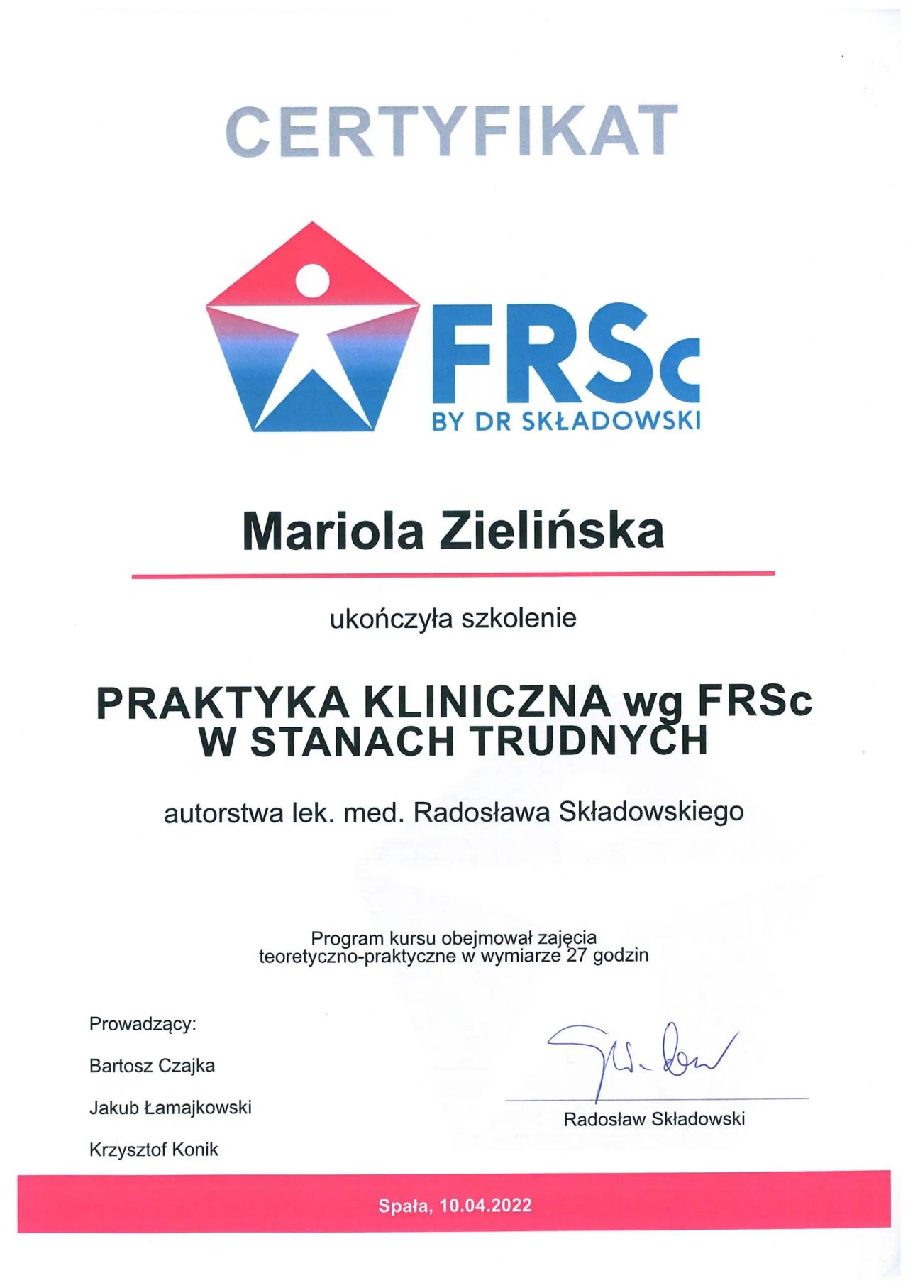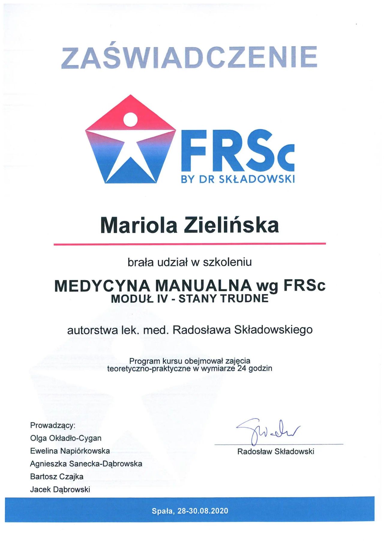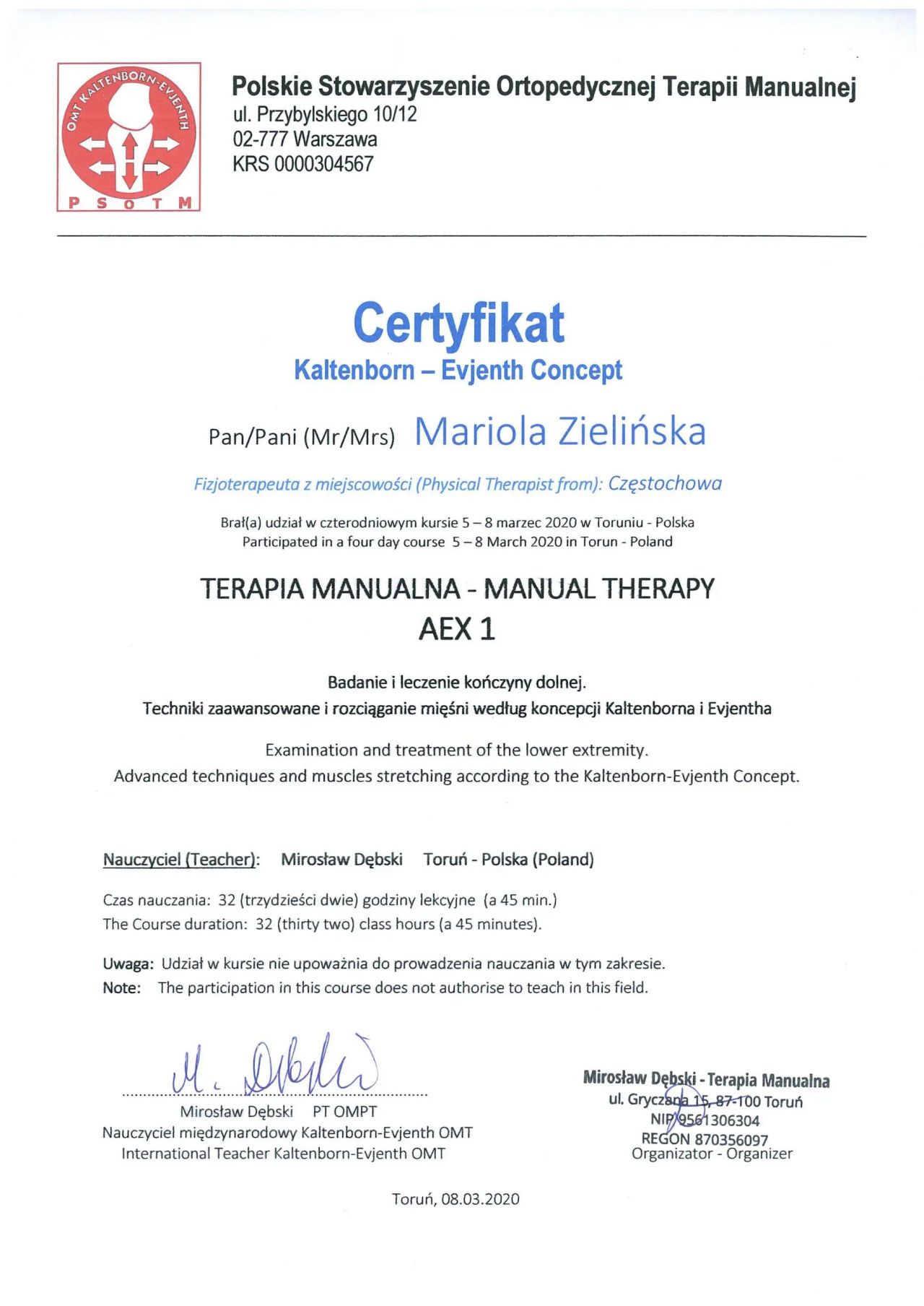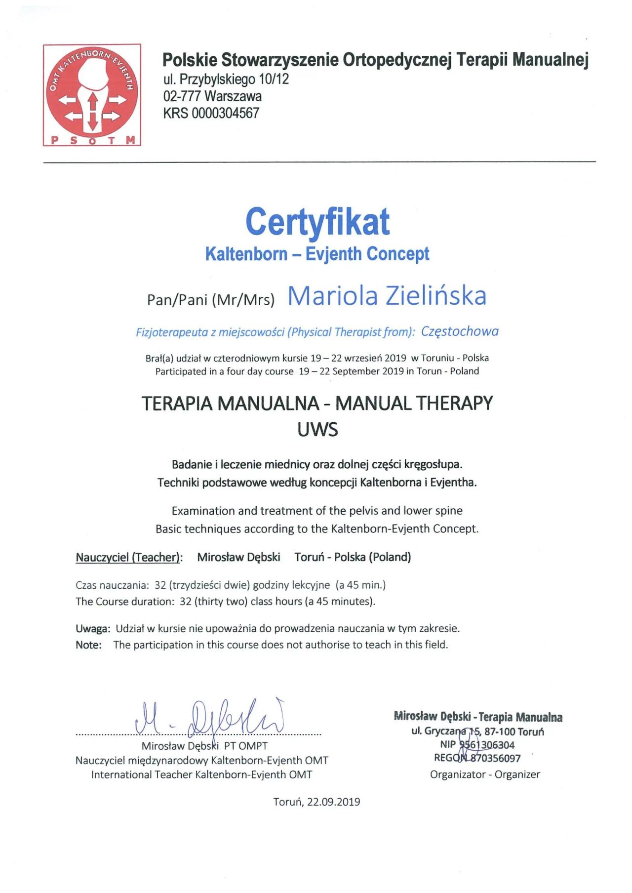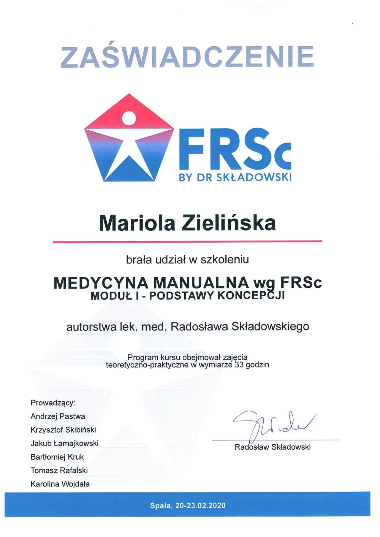 Pani Mariola Zielińska wyleczyła mój bark. Z empatią i zaangażowaniem zastosowała skuteczne metody leczenia. Wyjaśniła przyczyny bólu i niesprawności barku, dała zalecenia. Dziękuję