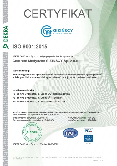 Porady z jakiego zakresu oferuje Centrum Medyczne Gizińscy, Bydgoszcz?Centrum Medyczne Gizińscy, Bydgoszcz dysponuje dużym zespołem o następujących zakresach porad: alergologia, psychologia, anestezjologia, endokrynologia, pediatria, ginekologia, psychiatria, laryngologia, chirurgia dziecięca, ortopedia, laryngologia dziecięca, interna, chirurgia plastyczna, gastrologia, neurologia, neurochirurgia, medycyna chorób zakaźnych, okulistyka, urologia, stomatologia, onkologia dziecięca, radiologia, dermatologia, neurologia dziecięca, chirurgia naczyniowa, diabetologia, angiologia, dietetyka, diagnostyka, fizjoterapia, hematologia dziecięca, hepatologia, medycyna estetyczna, ortopedia dziecięca, psychologia dziecięca, psychoterapia, pulmonologia, pulmonologia dziecięca, ultrasonografia, stomatologia dziecięca, urologia dziecięca, wenerologia.