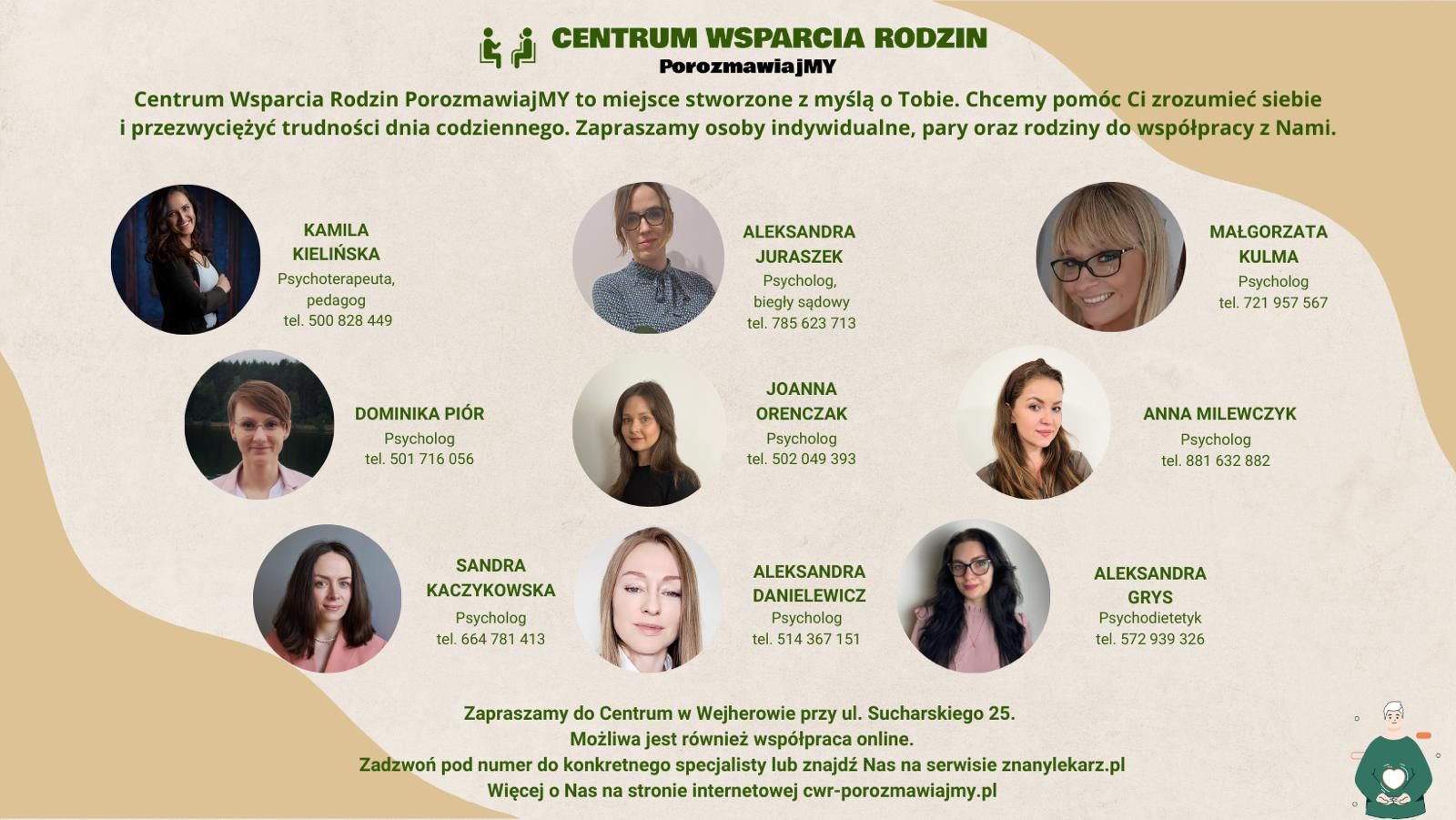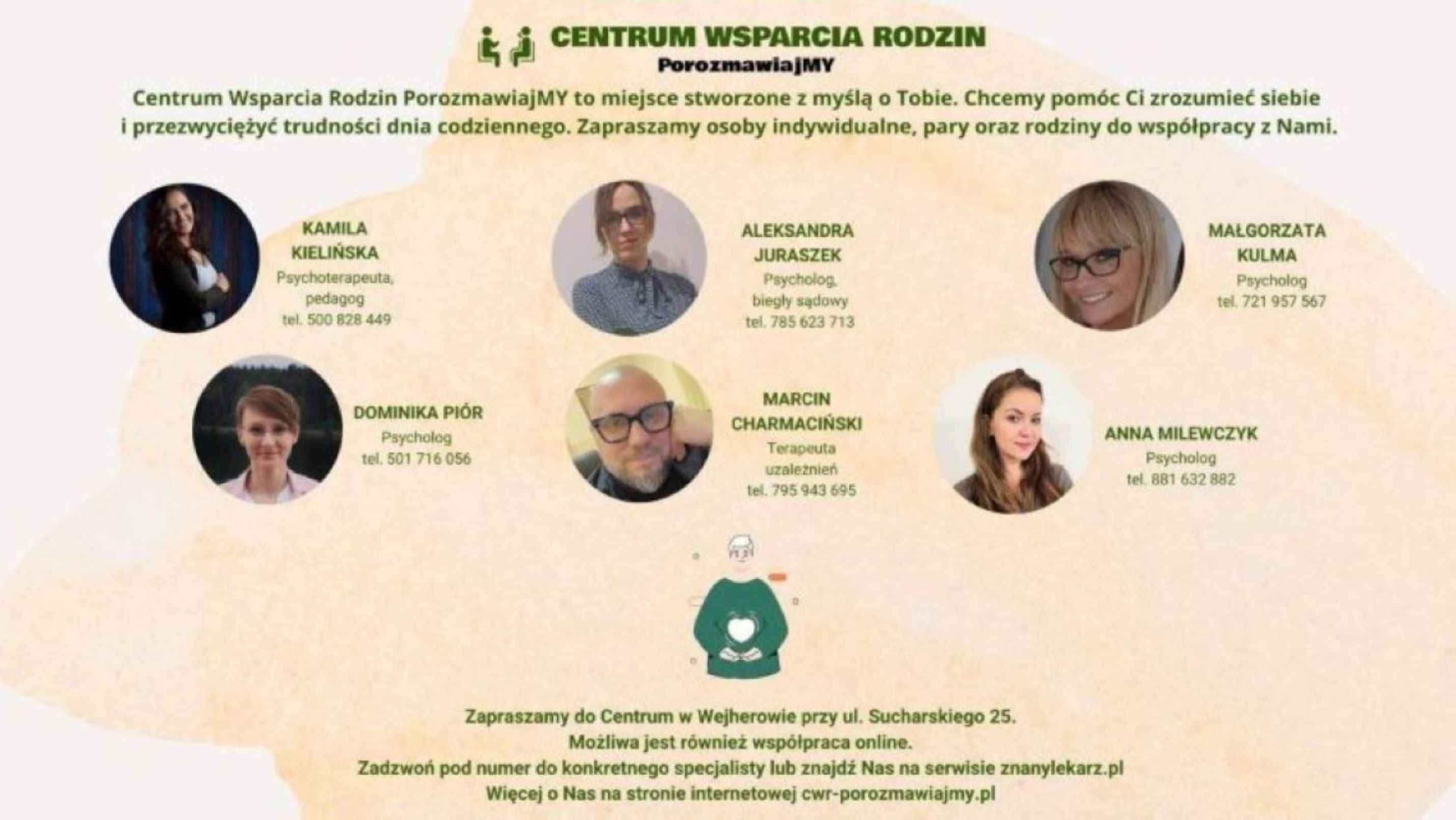 entrum Wsparcia Rodzin PorozmawiajMY mieści się na przedmieściach Wejherowa. Zostało założone przez Kamilę Kielińską – pedagoga, socjologa i psychoterapeutę. Centrum tworzą specjaliści z zakresu psychologii i psychoterapii. Nasz Zespół łączy profesjonalizm oraz spójna filozofia w podejściu do pracy. Chcemy, aby Centrum było dla Ciebie czymś więcej niż tylko miejscem. Zależy nam abyś czuł, że jesteś u nas bezpieczny i akceptowany.