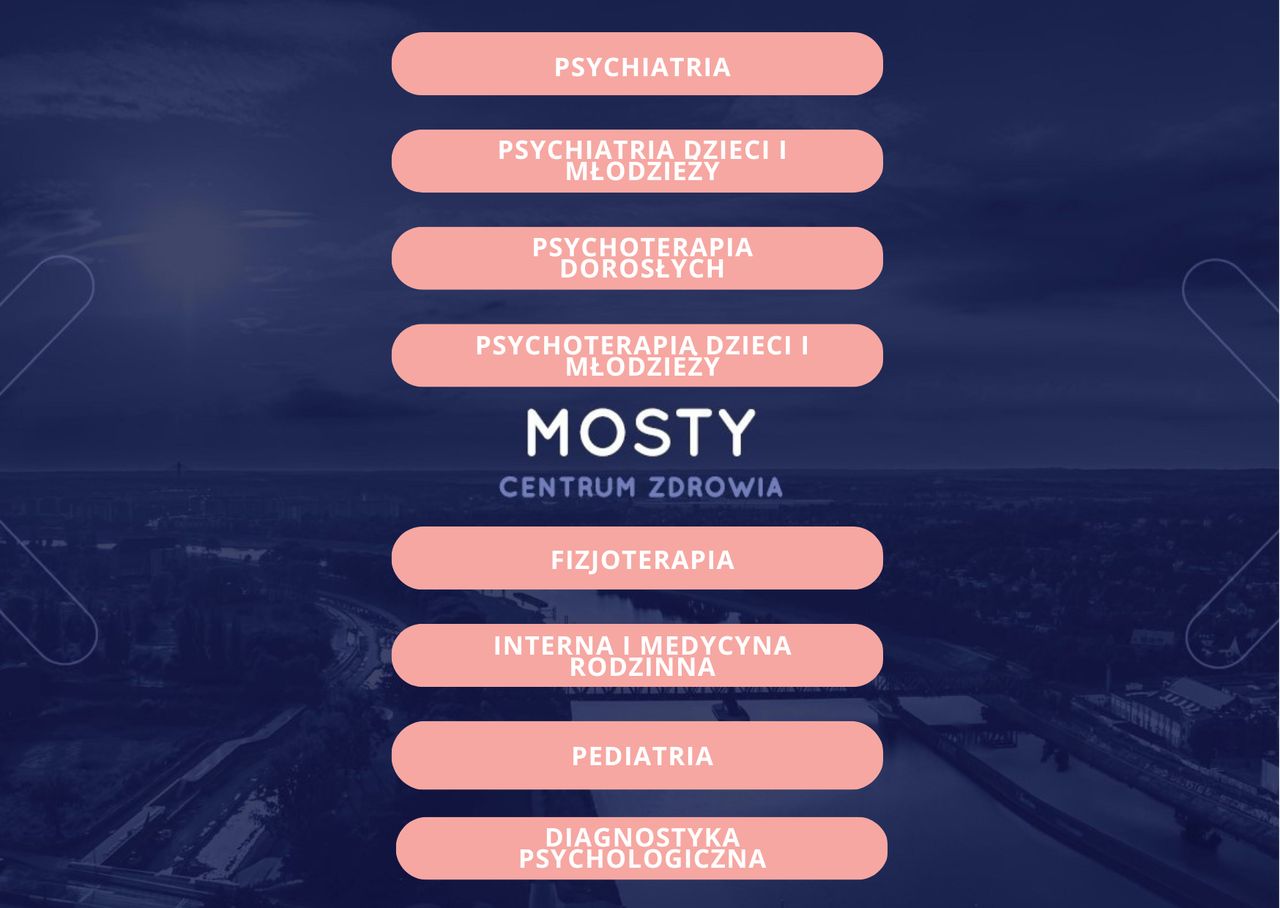 Oferta Centrum Zdrowia Mosty obejmuje 70 usług. Poniżej wybrane usługi świadczone przez zespół tej placówki: konsultacja psychiatryczna (pierwsza wizyta), konsultacja diagnostyczna ADHD dorosłych, konsultacja psychiatryczna (kolejna wizyta), psychiatric consultation in English, konsultacja psychiatryczna młodzieży (kolejna wizyta), konsultacja psychiatryczna młodzieży (pierwsza wizyta), Kwalifikacja do leczenia esketaminą, konsultacja pediatryczna, Konsultacja pediatryczna (bilans zdrowia dziecka), konsultacja internistyczna.