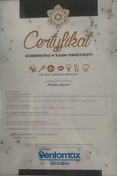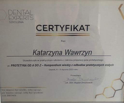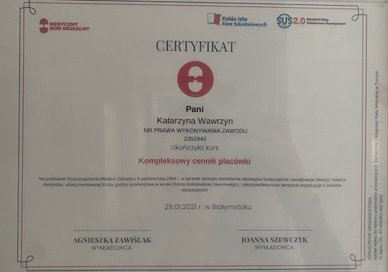 Nie polecam kliniki, bo jest drogo, a za tym nie idzie efekt. Niestety nie znam nazwiska dentystki. Może była jakąś uczącą się jeszcze, bo w czasie wizyty przyszła pani doktor, której ta młoda zawzięcie tłumaczyła i pokazywała, co zrobiła i co jest jeszcze do roboty w mojej paszczy. Ach! Duży nacisk położyła na stwierdzenie, że "dziś nie zrobiłyśmy zdjęcia, zrobimy na następnej wizycie".
