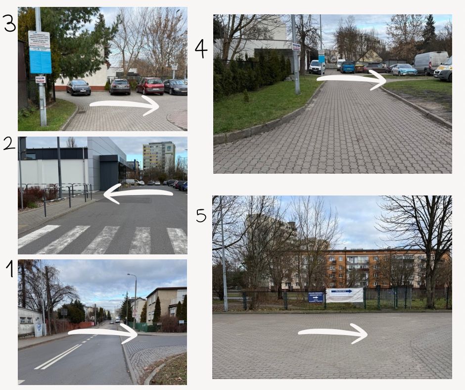 Następnie kierować się wzdłuż budynku sklepu Lidl, potem skręcić w prawo za budynkiem Hotel Homer i jeszcze raz w prawo. Prosimy kierować się zgodnie ze znakami umieszczonymi na słupach oświetleniowych.