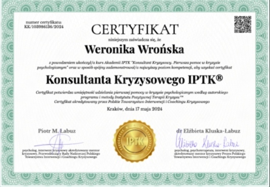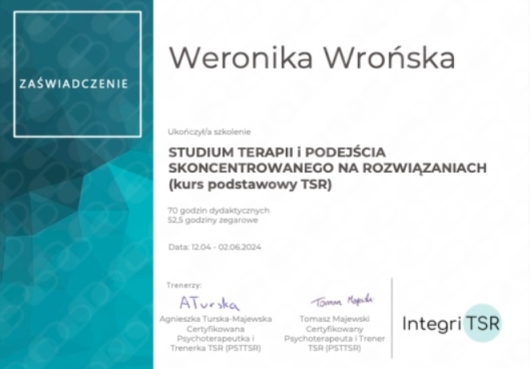 Do Weroniki trafiłam w ciężkim okresie swojego życia i złym stanie psychicznym. Zdecydowałam się na terapię po namowie przyjaciółki, ale muszę szczerze przyznać, że była to najlepsza decyzja jaką mogłam podjąć. Nie jestem w stanie opisać jak bardzo Weronika mi pomogła. Wyczekiwałam każdej kolejnej sesji, bo na każdej dowiadywałam się czegoś nowego o sobie i świecie dzięki jej pomocy. Jeśli ktoś się zastanawia nad wyborem psychologa - ja z całego serca polecam terapię u Weroniki. Przeszłyśmy razem długą drogę, ale mogę szczerze powiedzieć, że udało mi się zrozumieć swoje problemy i znacząco osłabić ich wpływ na moje życie. Tak więc terapię zaczynałam w strasznym dole psychicznym, a kończę z nowym spojrzeniem na świat, zrozumieniem, wglądem w siebie i radością z życia, a to wszystko dzięki współpracy z Weroniką, za którą jestem niesamowicie wdzięczna.