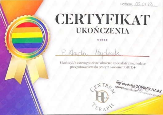 Klaudia jest terapeutką, którą z czystym sumieniem mogę polecić. Profesjonalna, zawsze przygotowana i zaangażowana w cały proces terapeutyczny.