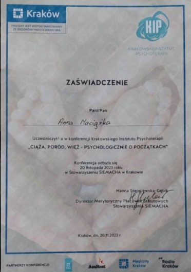 Nasze specjalistki: Anna Maciążka – psycholog i psychotraumatolog, oferująca wsparcie psychologiczne dla dorosłych, terapię par oraz wsparcie okołoporodowe. Pomaga przepracować trudne doświadczenia, szczególnie dbając o relację opartą na bliskości i empatii.