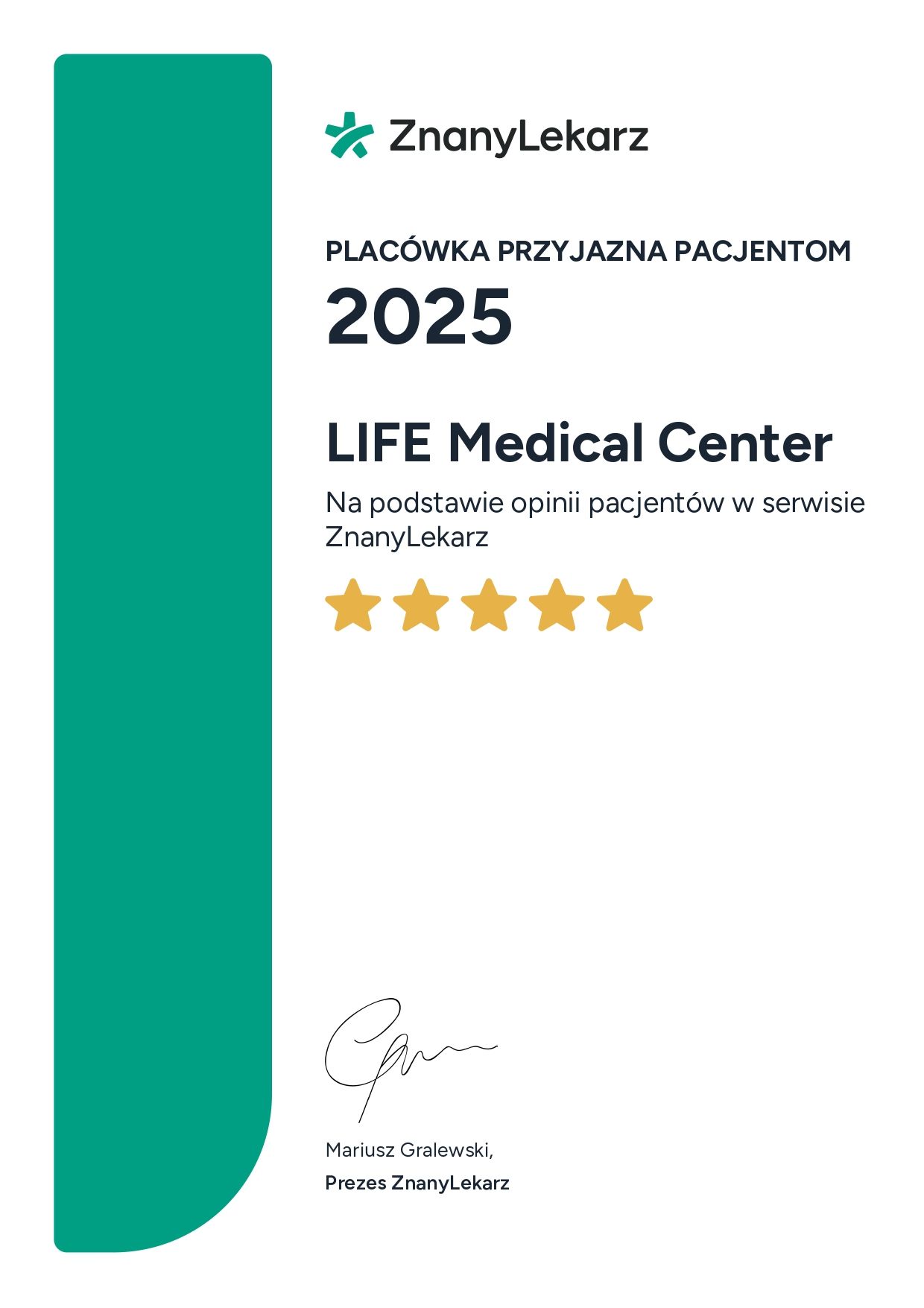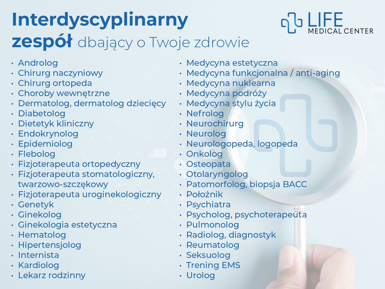 LIFE Medical Center to miejsce, w którym łączymy wiedzę i doświadczenie specjalistów z wielu dziedzin medycyny, tworząc kompleksowy, interdyscyplinarny model opieki zdrowotnej. Wierzymy, że zdrowie to harmonia ciała i umysłu – dlatego nasi lekarze współpracują ze sobą, aby zapewnić pacjentom pełną i skuteczną opiekę na każdym etapie diagnostyki i leczenia.