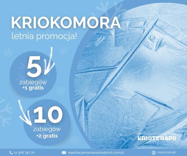 Małopolskie Centrum Krioterapii jest Niepublicznym Zakładem Opieki Zdrowotnej działającym na terenie miasta Krakowa od przeszło 20 lat. MCK oferuje szeroki zakres nowoczesnych usług w zakresie fizjoterapii, w tym rehabilitacji ruchowej, fizykoterapii i masażu w dwóch lokalizacjach: