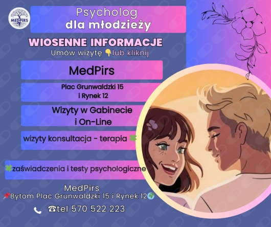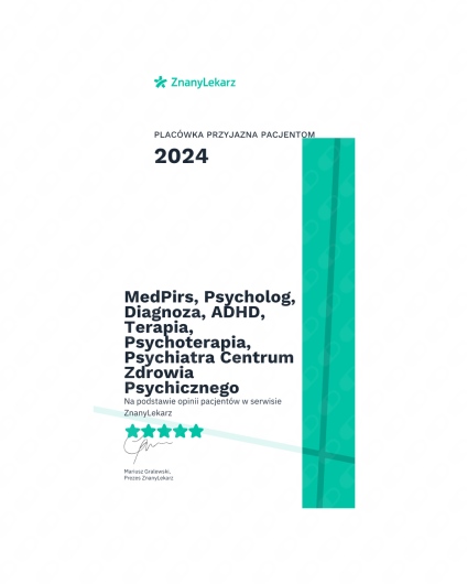 Psycholog | Psychoterapeuta | Diagnoza ADHD | Terapia | Psychoterapia | Psychiatra | Centrum Zdrowia Psychicznego. W Gabinecie i ONLINE Diagnoza i Testy: ADHD, DIVA-5, Zaburzeń Osobowości oraz Depresja, Zaburzenia afektywne, Zaburzenia lękowe - ( zaburzenia lękowe uogólnione, Fobia społeczna, Agorafobia, OCD, kryzys psychiczny, ChAD. terapia indywidualna, par i małżeństw. Prowadzimy terapię - Poznawczo-behawioralną, CBT, DBT, Systemowa, Psychodynamiczna, Test ADHD i diagnoza z wynikiem i opisem. Test MMPI-2 diagnoza z wynikiem i opisem - Test zaburzeń osobowości SCID-5 z diagnozą i opisem. Opinia, zaświadczenie Bariatryczne. Rekomendowani psycholodzy w Bytomiu, Piekarach Śląskich, Tarnowskich Górach, Krakowie, Warszawie: - Oferujemy profesjonalną pomoc online i stacjonarnie w MedPirs Bytom Plac Grunwaldzki 15 i Rynek 12 - z nami poczujesz się zrozumiany i bezpieczny. MedPirs - Twoje zdrowie psychiczne jest naszym priorytetem. U nas również przyjmują Psychiatrzy, Psychiatra Bytom, Psychiatra Piekary Śląskie, Psychiatra Tarnowskie góry Psycholog w Bytomiu, Piekary Śląskie, Tarnowskie Góry, Kraków, Warszawa Teraz możesz skorzystać z konsultacji online w języku polskim i angielskim! psychological consultation in English, psychotherapy in English, Individual therapy in english, psychological consultation in English online, Couple psychotherapy in English, Couple psychotherapy in English (on-line) Nasi specjaliści są dostępni dla Ciebie, gdziekolwiek jesteś. Dyskomfort psychiczny nie musi Cię ograniczać. Umów się na wizytę Stacjonarną w gabinecie lub On-Line Szukasz psychologa w Bytomiu MedPirs Bytom Plac Grunwaldzki 15 i Rynek 12 Skontaktuj się z MedPirs! Oferujemy wsparcie psychologiczne online i stacjonarnie. Twoje zdrowie psychiczne jest w dobrych rękach. problemy i rozwiązania: Czujesz się przytłoczony/a? Nasz psycholog pomoże Ci uporać się z trudnościami. Stres, lęk, depresja? Nie musisz z tym walczyć sam/a. Skontaktuj się z nami. Inwestuj w swoje zdrowie psychiczne. Nasz psycholog w Bytomiu pomoże Ci odzyskać równowagę. Każdy z nas potrzebuje czasem wsparcia. Nasz zespół psychologów jest dla Ciebie. Zadzwoń lub napisz i dowiedz się więcej o naszej ofercie. Psycholog bez granic W placówce Medpirs: Przyjmują: Psycholodzy , Psychoterapeuci oraz lekarz Psychiatra. Przyjmujemy: Osoby dorosłe, młodzież i dzieci - wizyty stacjonarnie - Psycholog, Psychoterapeuta ( osoby dorosłe i młodzież ( nastolatki ) Psychiatra - osoby dorosłe. Dodatkowo: Psycholog i psychoterapeuci Online, Psycholog dziecięcy przyjmuje osoby dorosłe i dzieci od 4 roku życia. Leczymy: Leczenie i terapia, Diagnoza i Testy: ADHD, Zaburzeń Osobowości oraz Depresja, Zaburzenia afektywne, Zaburzenia lękowe - ( zaburzenia lękowe uogólnione, Fobia społeczna, Agorafobia, OCD, kryzys psychiczny. Terapia indywidualna, Terapia par i małżeństw, Terapia grupowa Prowadzimy terapię - Poznawczo-behawioralną, CBT, Systemową, Psychodynamiczną, Test ADHD i diagnoza z wynikiem i opisem. Test MMPI-2 diagnoza z wynikiem i opisem - Test zaburzeń osobowości SCID-5 z diagnozą i opisem. stanów chorób psychicznych. Lekarz psychiatra prowadzi terapię, wystawia: recepty na leki, wystawia w razie potrzeby L4. Z uwagi na terminy: Zapraszamy serdecznie do kontaktu telefonicznego z placówką celem umówienia wizyty. Znajdujemy się w centrum Bytomia - Śródmieście oraz oddział Piekary Śląskie i Tarnowskie Góry, Kraków, Warszawa Dojedziesz do nas z każdej miejscowości śląska, a w szczególności: okolice Bytomia, Radzionków, Tarnowskie Góry, Piekary Śląskie, Zabrze, Gliwice, Ruda Śląska, Chorzów, Katowice, Siemianowice Śląskie, Świętochłowice, Bobrowniki, itp nerwica depresja kryzys życiowy zaburzenia nastroju lęki kryzys emocjonalny stres zaburzenia emocjonalne zaburzenia lękowe zaburzenia psychiczne Diagnoza psychologiczna, interwencja kryzysowa, konsultacja psychologiczna, ChAD, zaburzenia lękowe, zaburzenia obsesyjno-kompulsyjne, Agorafobia, Zaburzenia lękowe uogólnione, lęk uogólniony, Zaburzenia lękowe i depresyjne, mieszane, Fobie, Zaburzenia snu, zaburzenia osobowości, zaburzenia osobowości z pogranicza borderline, Narcystyczne zaburzenia osobowości, Histrioniczne zaburzenia osobowości, anakastyczne, Unikowe zaburzenia osobowości, Zależne zaburzenia osobowości, stacjonarnie i online. Prowadzimy diagnostykę psychologiczną: Pomiar inteligencji emocjonalnej INTE, PKIE, Pomiar cech osobowości NEO-FFI, pomiar poziomu lęku i depresji GAD-7 i HADS, pomiar poziomu lęku i depresji oraz jej cech składowych GAD-7 i KPD, Ocena funkcji poznawczych MoCA, Ocena funkcji poznawczych MMSE, ACE III, Pakiet na badanie funkcji poznawczych, Badanie cech osobowości ACL, Pakiet na badanie osobowości i inteligencji emocjonalnej, Badanie cech niepożądanych TriPM-41, Badanie osobowości i zaburzeń MMPI-2, Pomiar stresu i lęku PSS-10 i GAD-7, Badanie cech osobowości EPQ-R, Badanie funkcjonowania emocjonalnego EPQ-R, PSS-10, GAD-7, KPD, INTE, Pomiar inteligencji ogólnej TMS-K - Test Matryc Ravena w Wersji Standard - Forma klasyczna, Diagnoza zaburzeń osobowości SCID-5, Diagnoza ADHD DIVA-5, Badanie ADHD DIVA-5, Wywiad diagnostyczny oraz badanie inwentarzem MMPI-2, Pacjentów z Bytomia, Piekary Śląskie, Radzionków, Chorzów, Zabrze, Gliwice, Katowice, Siemianowice Śląskie, Świętochłowice, Będzin, Tarnowskie Góry, Kraków, Warszawa po wybraniu terminu wizyty prosimy o kontakt telefoniczny, celem potwierdzenia wizyty do psychologa, lub psychoterapeuty lub psychiatry pod dostępne rodzaje wizyt: Konsultacja psychologiczna dla dzieci i młodzieży (pierwszorazowa) Od 200 zł Konsultacja psychologiczna Konsultacja psychologiczna Diagnoza ADHD test diva 5.0 Diagnoza ADHD Warsztaty psychologiczne Poradnictwo psychologiczne Psychoterapia indywidualna Ocena stanu psychicznego Poradnictwo dietetyczne Konsultacja psychoterapeutyc