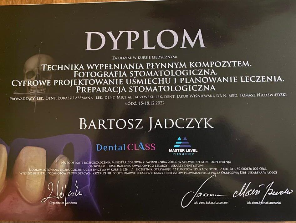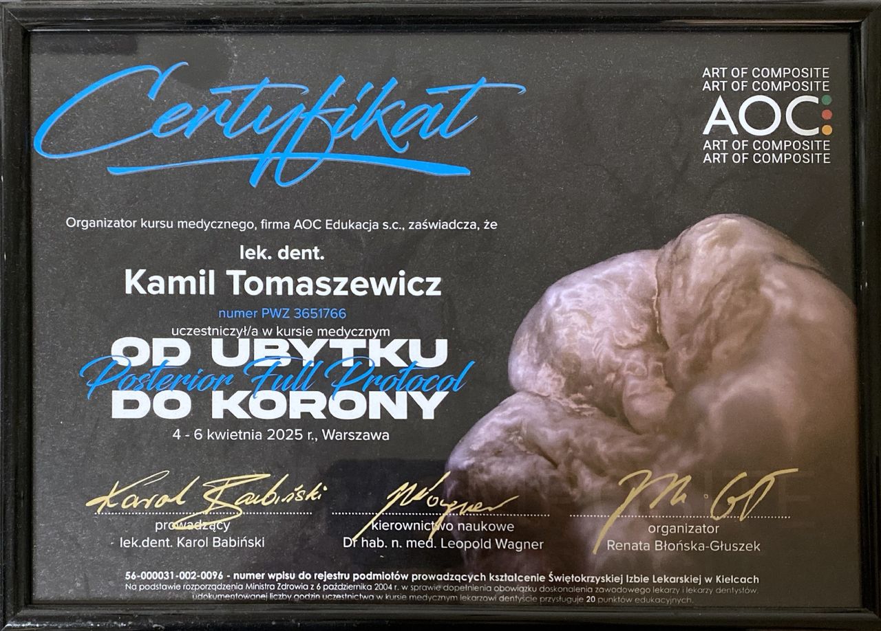 Każdy stomatolog w naszym zespole posiada wieloletnie doświadczenie kliniczne oraz regularnie podnosi swoje kwalifikacje na kursach i szkoleniach z zakresu nowoczesnej stomatologii i implantologii.