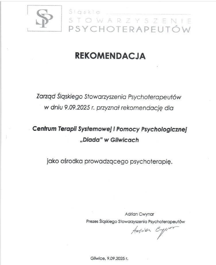 We wrześniu 2025 r. zostaliśmy ośrodkiem psychoterapii rekomendowanym przez Śląskie Stowarzyszenie Psychoterapeutów