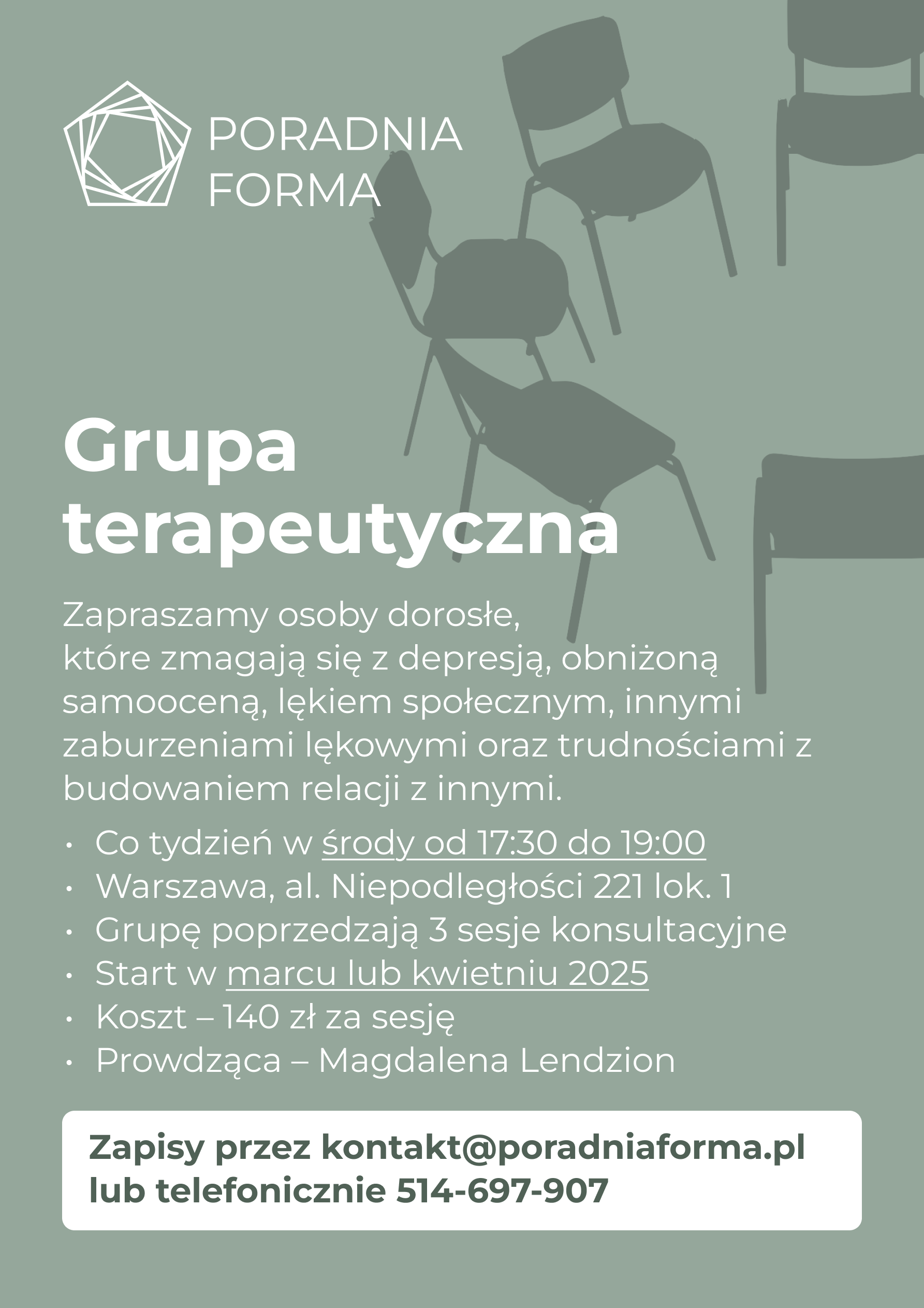 Zapraszamy do udziału w naszej nowej formie terapii – terapii grupowej. Zgłoszenia: kontakt@poradniaforma.pl oraz telefoniczne 514-697-907.