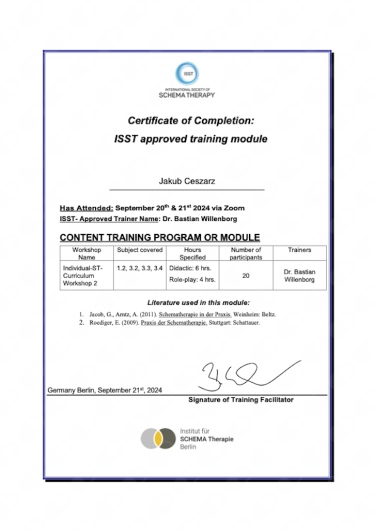 Początkowo przez pół roku pracowaliśmy nad moim OCD. Następnie kontynuowałem terapię przez ponad rok z powodu silnych problemów psychosomatycznych oraz schematów, które znacząco wpływały na moje codzienne funkcjonowanie.