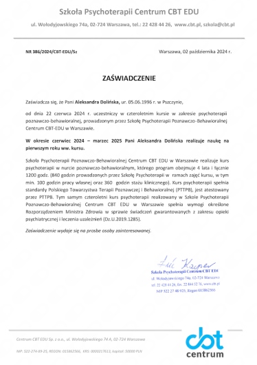 Od kwietnia bieżącego roku mam przyjemność korzystać z usług Poradni Psychoterapii CBT i Seksuologii Jakub Cesarz, gdzie podjąłem terapię poznawczo-behawioralną (CBT). Moją terapeutką jest Pani Dagmara Wiśniewska.