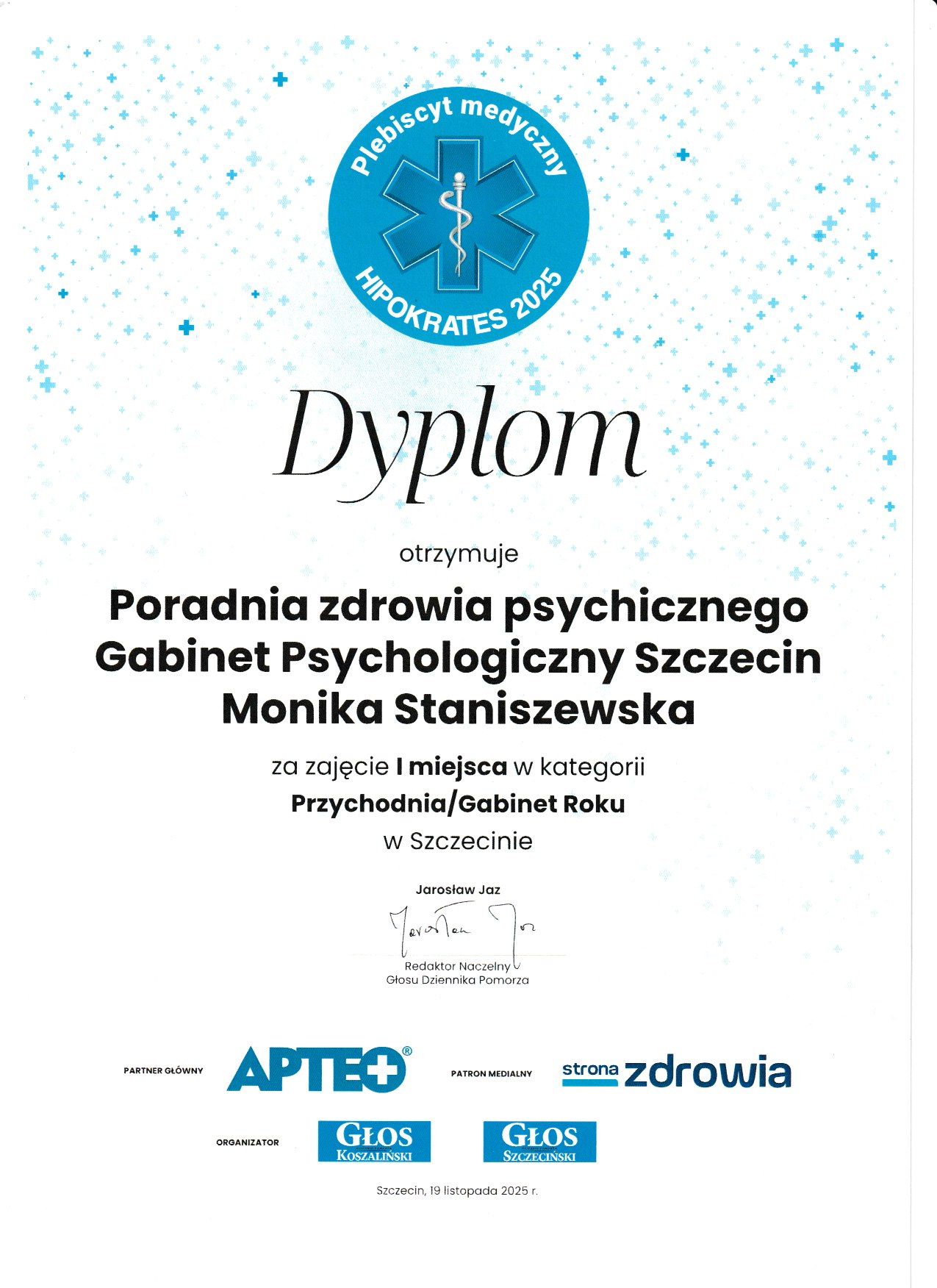 Rozpocząłem podróż z Dr. Staniszewską we wrześniu 2025 po burzliwym zakończeniu związku trwającym 10lat. Dzięki regularnym wizytą, w których jako pacjent czułem się komfortowo, wysłuchany, zaopiekowany oraz poprowadzony przez kolejne rozmowy, efektem końcowym jest uporządkowany chaos w głowię który panował i ponowny powrót na drogę życia. Myślę, że o ile początkowe wizyty nie były łatwe i przyjemne, o tyle każda kolejna wizyta przynosiła sporą dawkę rozwiązań czy wyjaśnień, które mi osobiście pomogły stanąć na nogi. Niektóre rozmowy mogły się wydawać oczywiste, niemniej z perspektywy czasu uważam że były konieczne, nawet jeśli nie jako coś nowo poznanego to jako swoiste przypomnienie. A dzięki ludzkiemu podejściu Moniki można poczuć się swobodnie w trakcie rozmów i myślę że właśnie to pomaga w utworzeniu pewnego rodzaju mostu porozumienia pomiędzy psychologiem a pacjentem. Na chwilę obecną próbuję dalej iść sam. Jednak planuję wizyty kontrolne. Polecam z całego serca specjalistkę :)