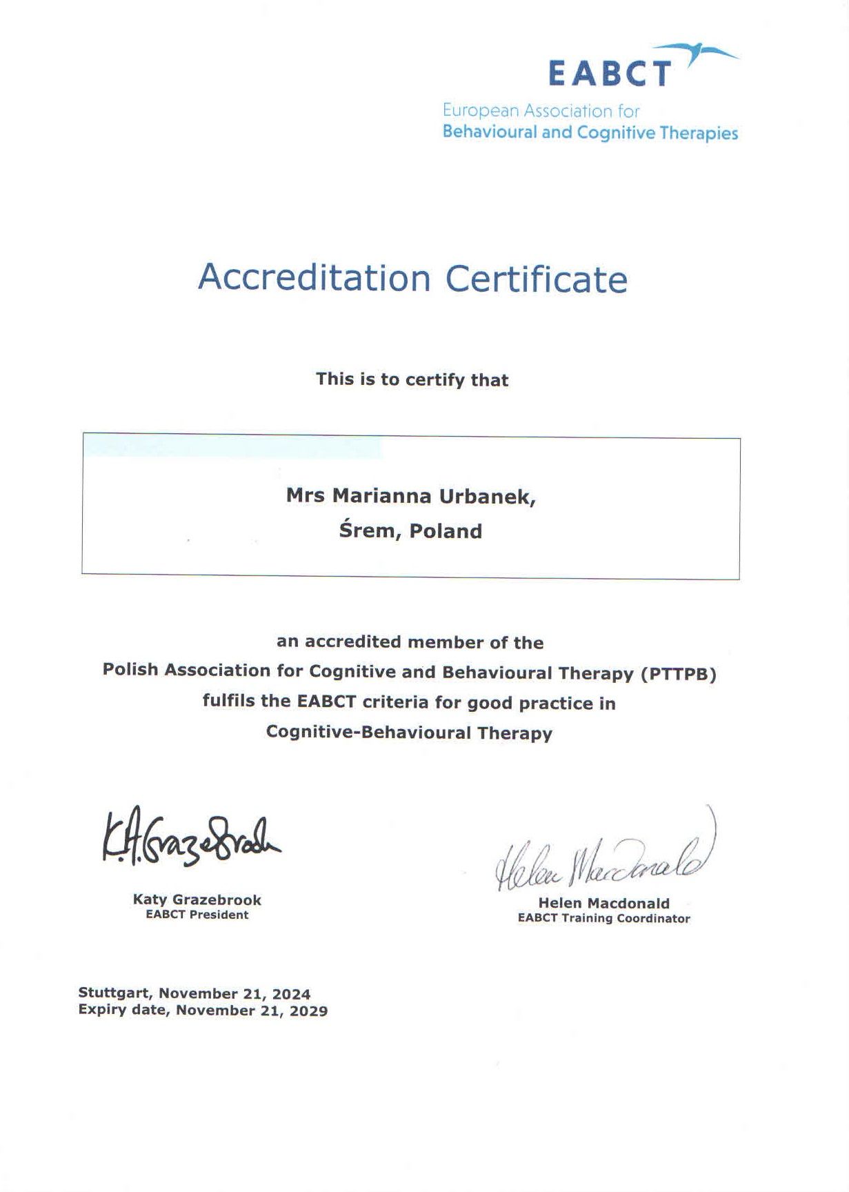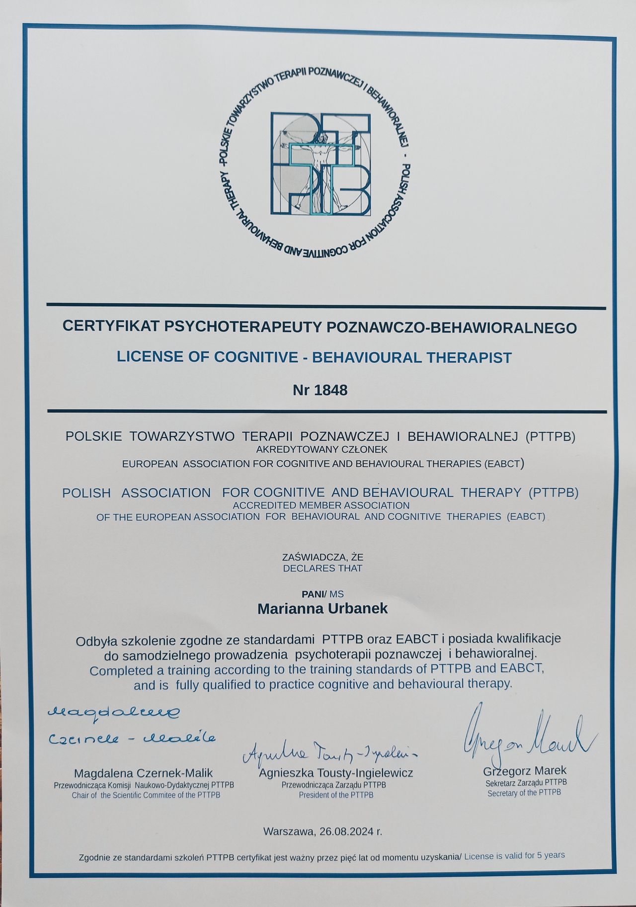 Gabinet Wsparcia i Psychoterapii Marianna Urbanek rozrasta się w Gabinet Psychoterapii - Pracownię CBT, gdzie specjaliści z zakresu terapii poznawczo-behawioralnej świadczą kompleksowe, profesjonalne usługi psychologiczno-terapeutyczne pod okiem certyfikowanego superwizora, zgodnie ze standardami NICE (The National Institute for Health and Care Excellence).