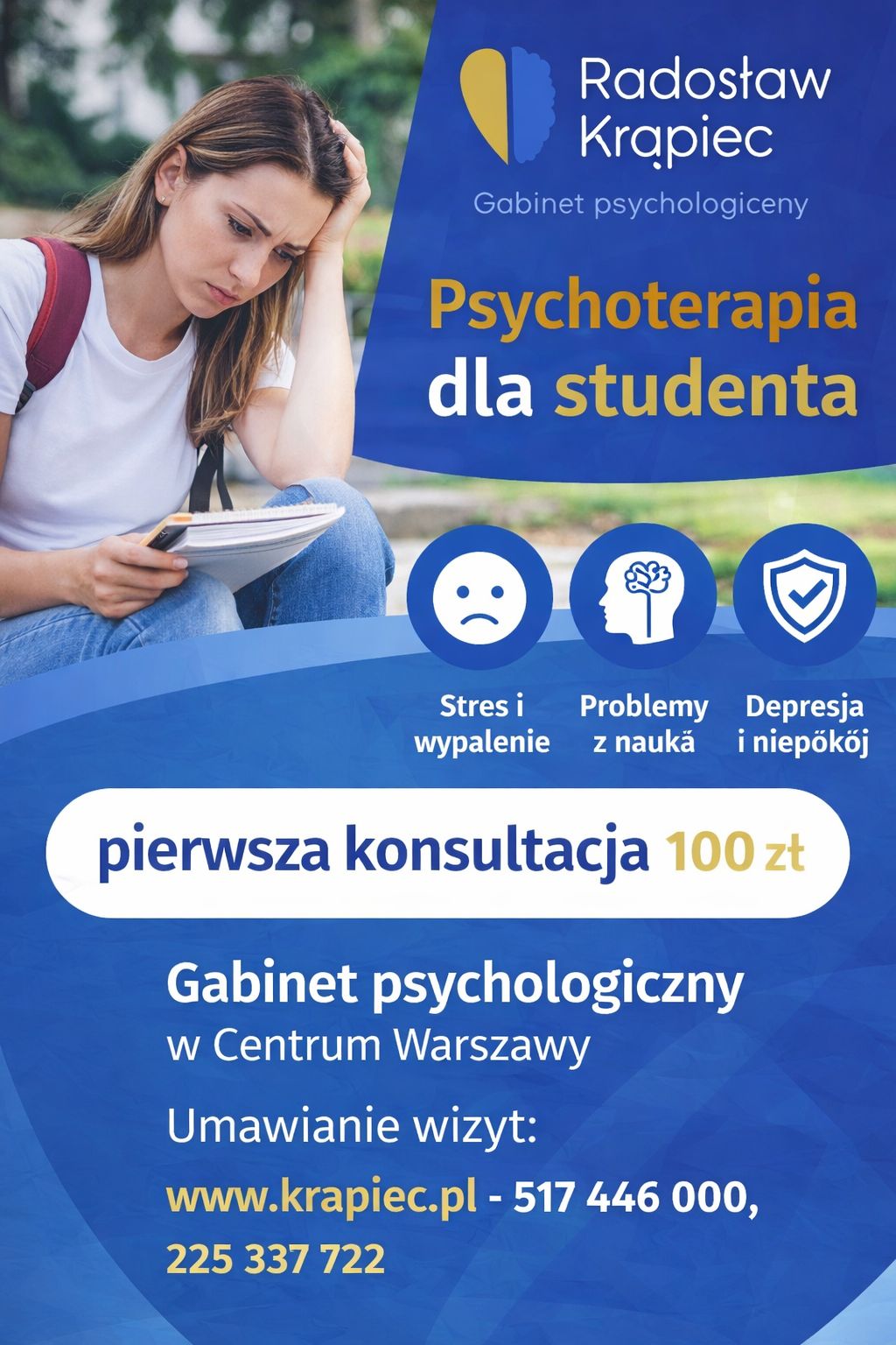 Radosław Krąpiec - gabinety psychologiczne to miejsce stworzone z myślą o osobach poszukujących rzetelnego wsparcia w obszarze zdrowia psychicznego. Jesteśmy kameralną poradnią, która oferuje profesjonalną pomoc psychologiczną oraz psychoterapię dla młodzieży od 16. roku życia i osób dorosłych. Zapewniamy kompleksowe wsparcie obejmujące diagnozę psychologiczną, konsultacje oraz proces psychoterapii dostosowany do indywidualnych potrzeb pacjenta.