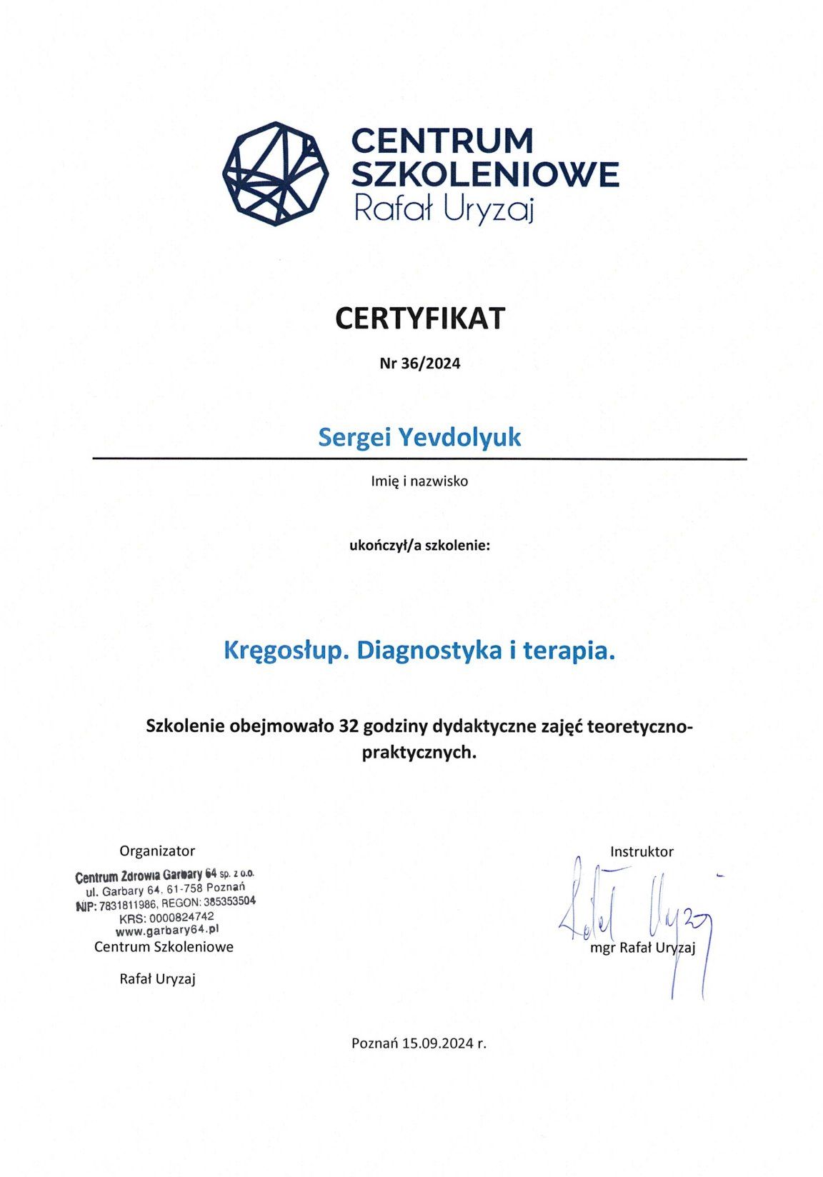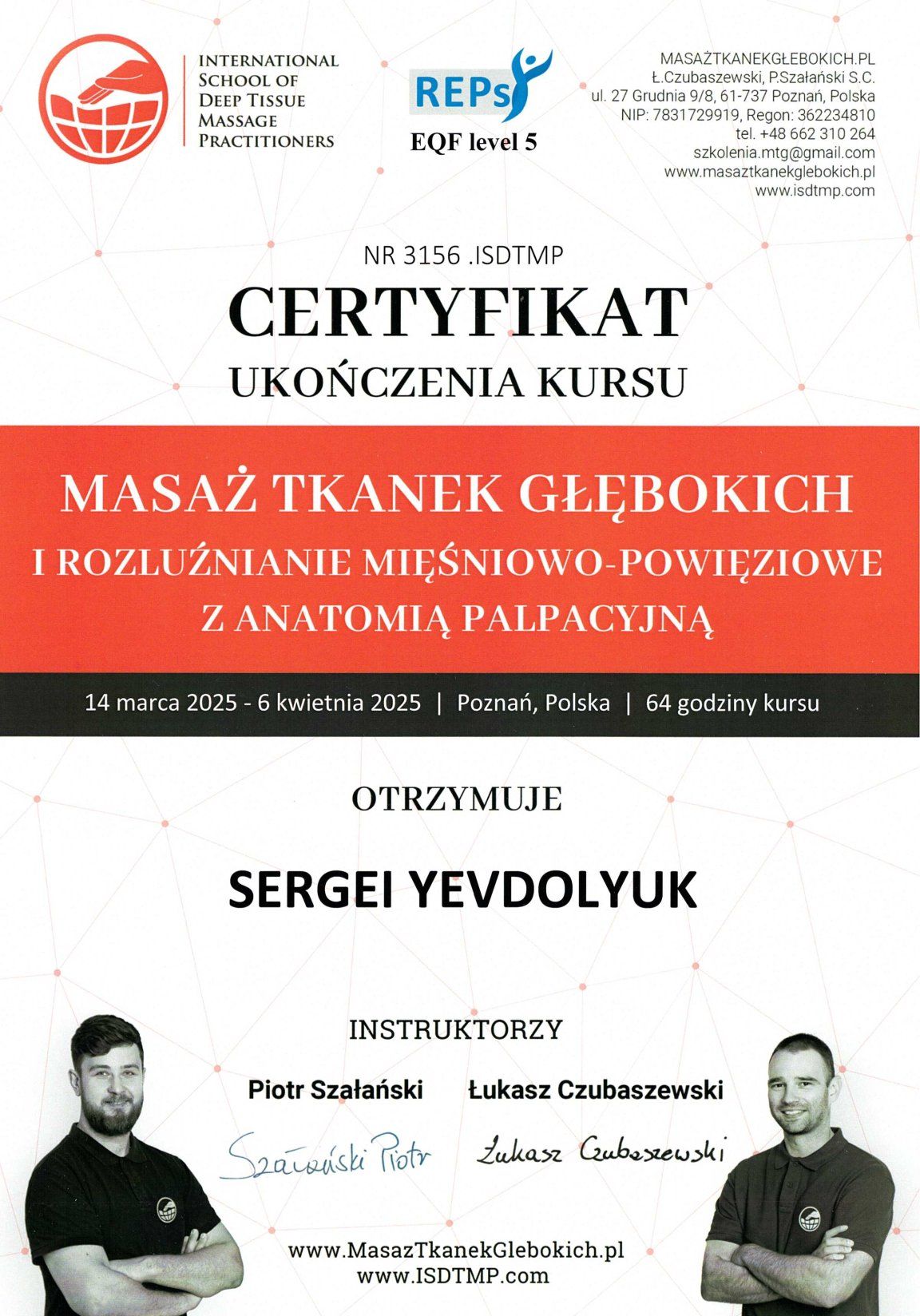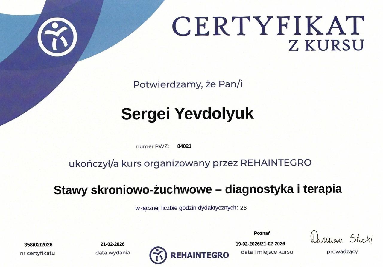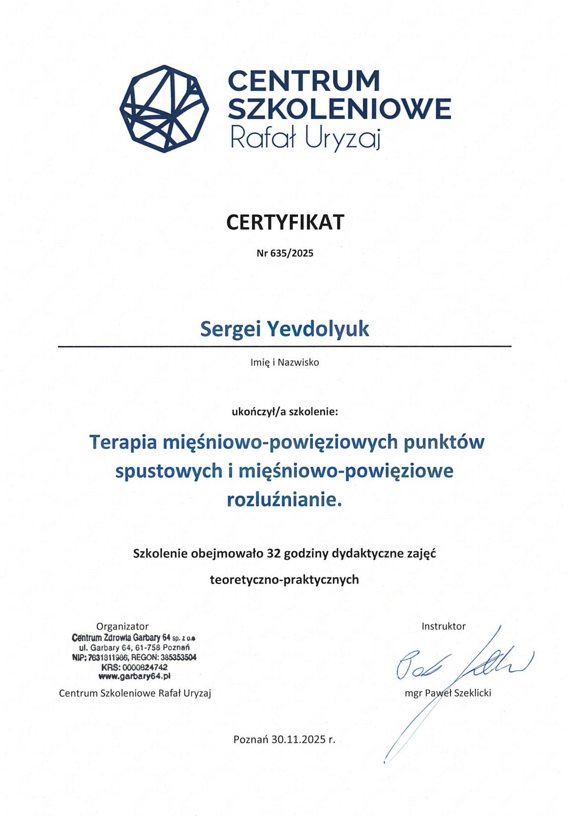 Już po 3 wizytach ból znacząco ustąpił, zakres ruchu został przywrócony, a ja w końcu mogę spać bez dyskomfortu. Pan Sergei podchodzi do pacjenta bardzo profesjonalnie, uważnie i rzeczowo, szczegółowo wyjaśniając każdy etap terapii. Czułem, że jestem w dobrych rękach i że zależy mu na moim zdrowiu – nie tylko na szybkim zleceniu usług.