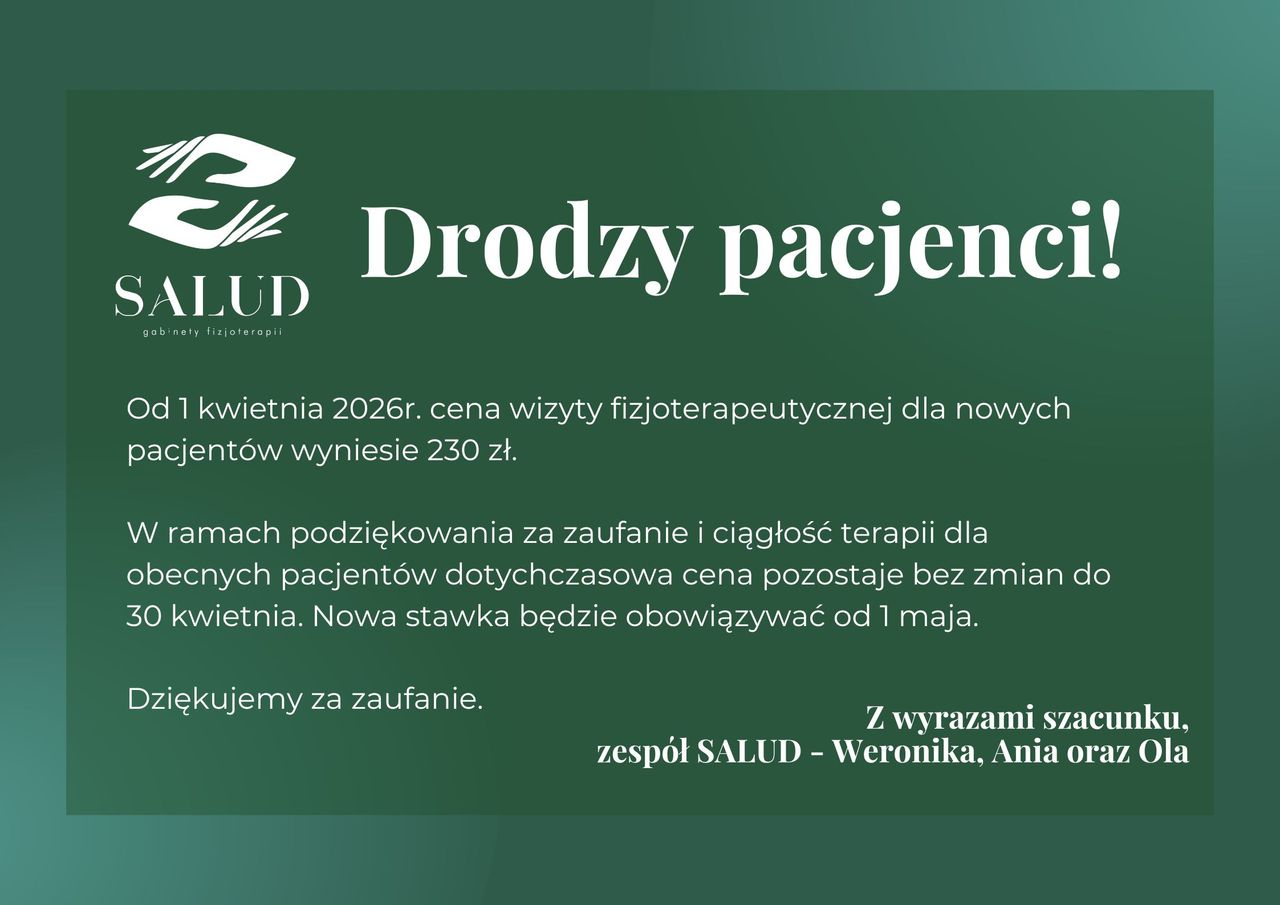 Od 1 kwietnia 2026r. cena wizyty fizjoterapeutycznej dla nowych pacjentów wyniesie 230 zł.