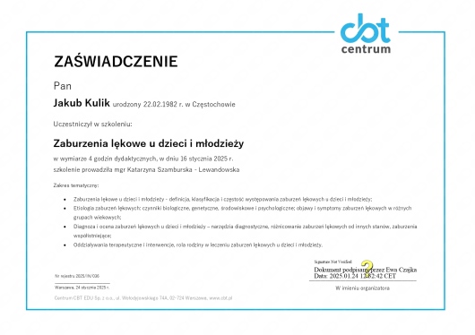 Profesjonalna pomoc, zrozumienie i poczucie bezpieczeństwa. Już po jednej wizycie czuję się dużo lepiej. Zdecydowanie polecam tę panią psycholog.