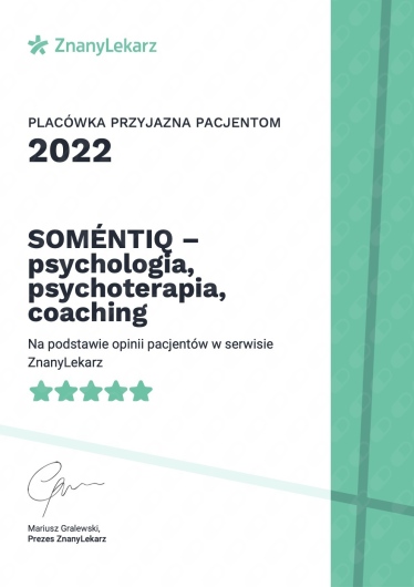 Czy SOMÉNTIQ – psychologia, psychoterapia, coaching oferuje wizyty online, bez potrzeby odwiedzenia placówki?Tak, SOMÉNTIQ – psychologia, psychoterapia, coaching oferuje konsultacje online. Wybierz konsultację online podczas umawiania wizyty, a zobaczysz dostępne terminy.