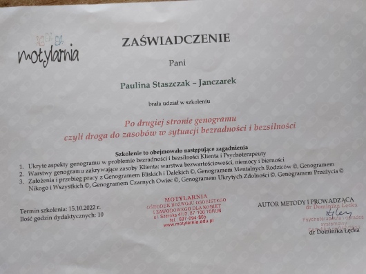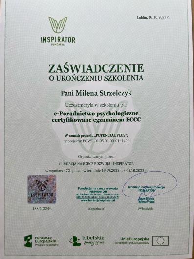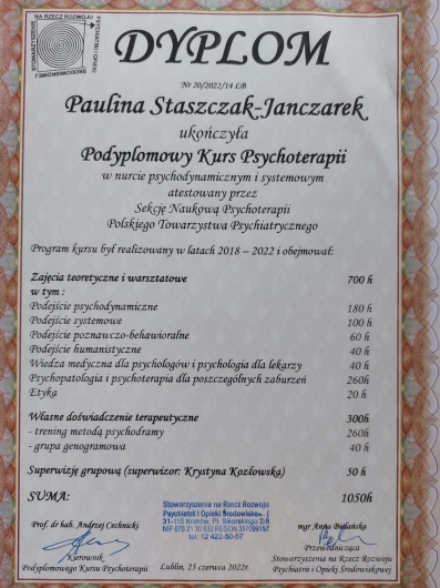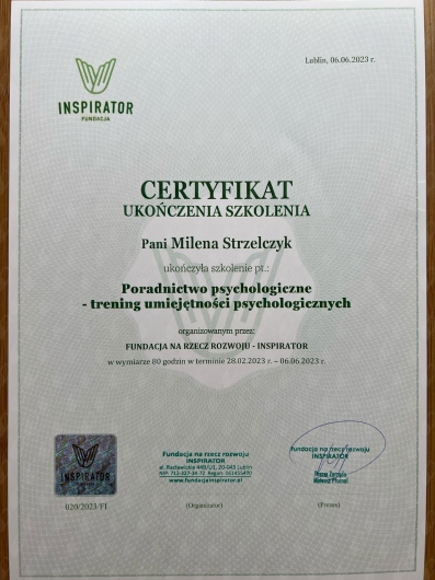 Bardzo polecam współpracę z Panią Julią, zdecydowanie można powiedzieć, że jest to psycholog z powołania! To była moja pierwsza wizyta u psychologa, byłam bardzo zestresowana, ciężko było mi zebrać słowa - z empatią i spokojem oraz przede wszystkim z chęcią zrozumienia spotkałam się z pytaniami pomocniczymi, zostało mi wszystko bardzo dokładnie wyjaśnione, zasady współpracy i spotkań były przedstawione bardzo szczegółowo. Nie był to zwykły „suchy” wywiad - pani Julia zadała mi kilka pytań, które skłoniły mnie do wielu refleksji już na samym początku naszej wspólnej pracy. Na następne spotkanie pójdę pełna nadziei na lepsze zrozumienie siebie i otwarta na nowe. Bardzo dziękuję za tak dużo ciepła i wsparcia jakiego doświadczyłam. Polecam!