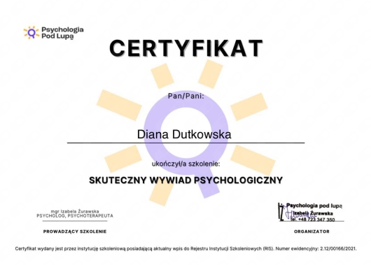 Z przyjemnością polecam Panią Diane, która jest miłą i ciepłą osobą, pełna zaangażowania. Potrafi cierpliwie i uważnie wysłuchać, zadaje trudne pytania i daje pomocne wskazówki.
