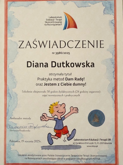 Jako rodzic dziecka w terapii czuję się równie zaopiekowana i widzę, że Pani Diana sumiennie przygotowuje się do terapii z moim dzieckiem. Polecam serdecznie!