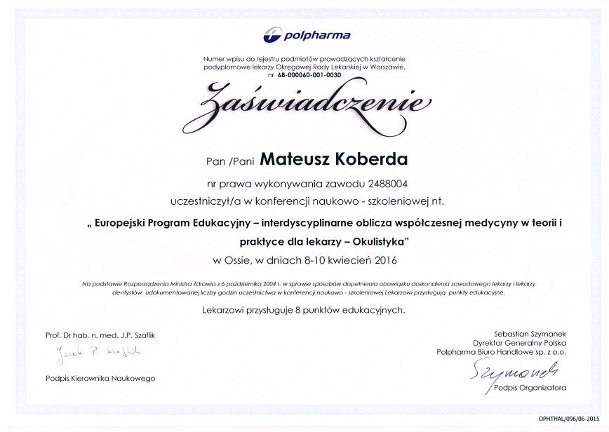 Wspaniały lekarz, bardzo uprzejmy i miły, dokładnie wyjaśnia stan pacjenta, szczegóły zabiegu, jest bardzo dokładny, w oczekiwaniu na zabieg miałem okazję przyglądać się wizytom maluchów, szcześliwe, rodzice spokojniejsi, dzieci zaopiekowane, ja osobiście miałem zabieg usunięcia gradówki, zabieg perfekcyjnie przeprowadzony, ze znieczuleniem, juz po wyjściu z gabinetu czułem ulgę a tydzień później moje kłopoty zdrowotne były już tylko wspomnieniem. Szczególne okladki i podziękowania dla super Pań wspierających doktora, przeniłe, życzliwe, cierpliwe, wspaniale pomagały dzieciom dobierać oprawki. Super czas w super miejscu, zdecydowanie polecam!