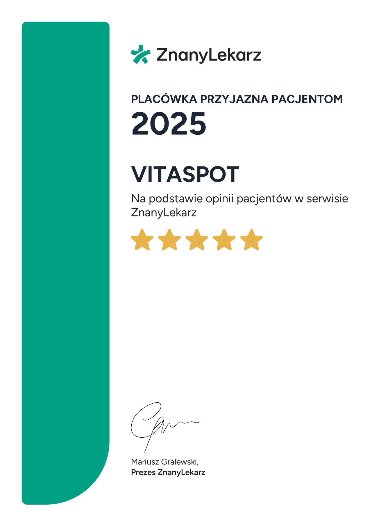 Drodzy Pacjenci, dziękujemy za zaufanie, którym obdarzają Państwo VITASPOT w pierwszym roku działalności naszej placówki. Z radością informujemy, że zostaliśmy wyróżnieni tytułem Laureata Orłów Medycyny 2025, a także otrzymaliśmy Certyfikat Jakości ZnanyLekarz 2025, przyznawany na podstawie opinii pacjentów. To dla nas ogromne wyróżnienie i motywacja do dalszej pracy. Pomimo dynamicznego rozwoju placówki stale dbamy o utrzymanie wysokiej jakości opieki i standardu świadczonych usług.