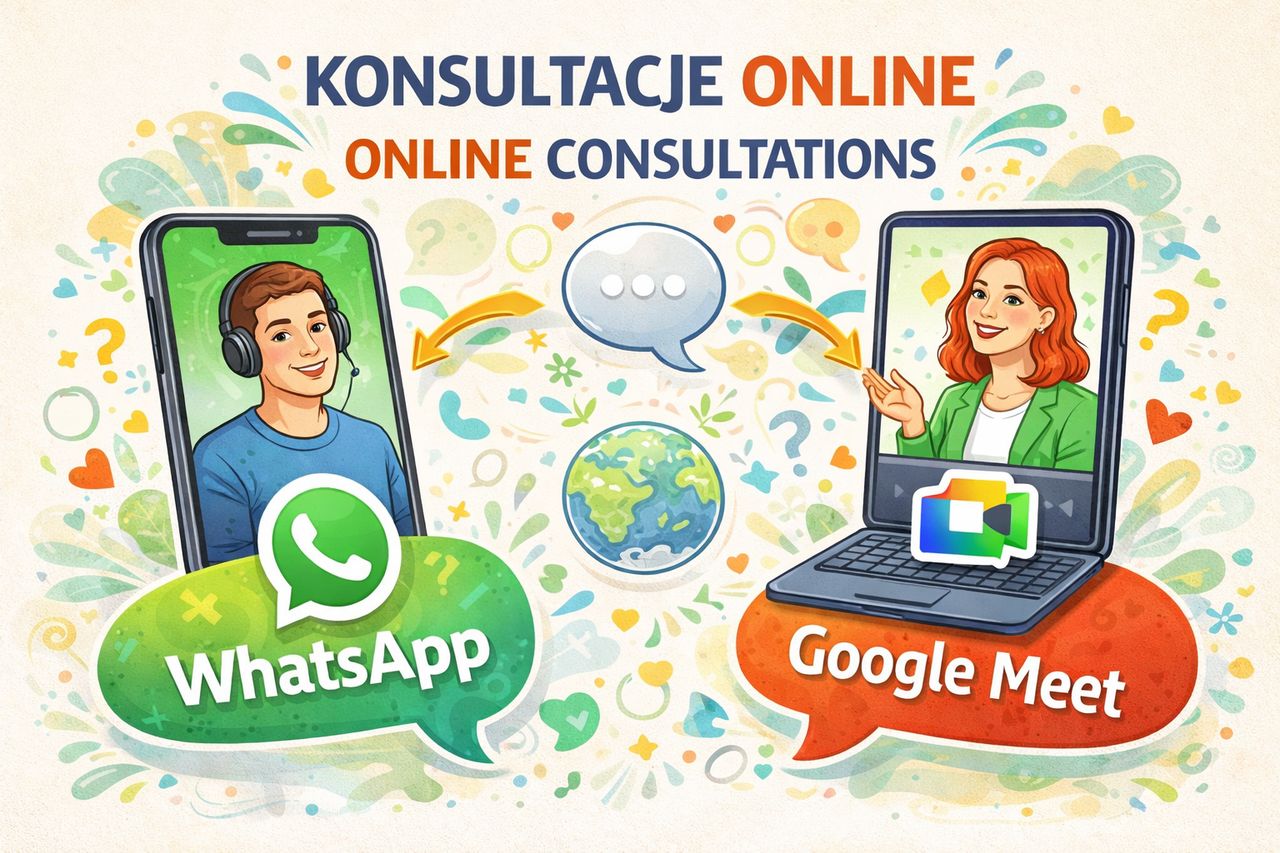 Prowadzimy również konsultacje online przez WhatsApp oraz Google Meet w języku polskim oraz angielskim!