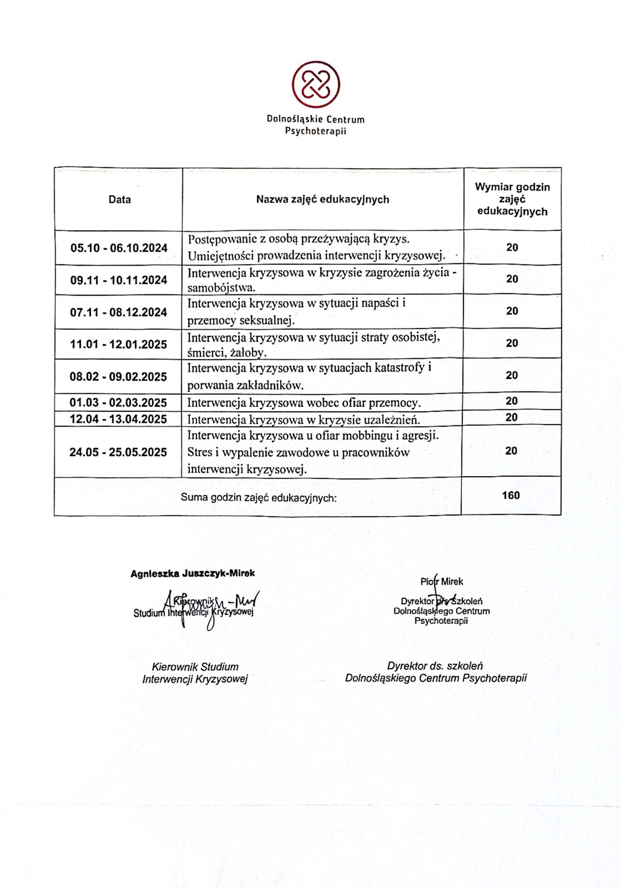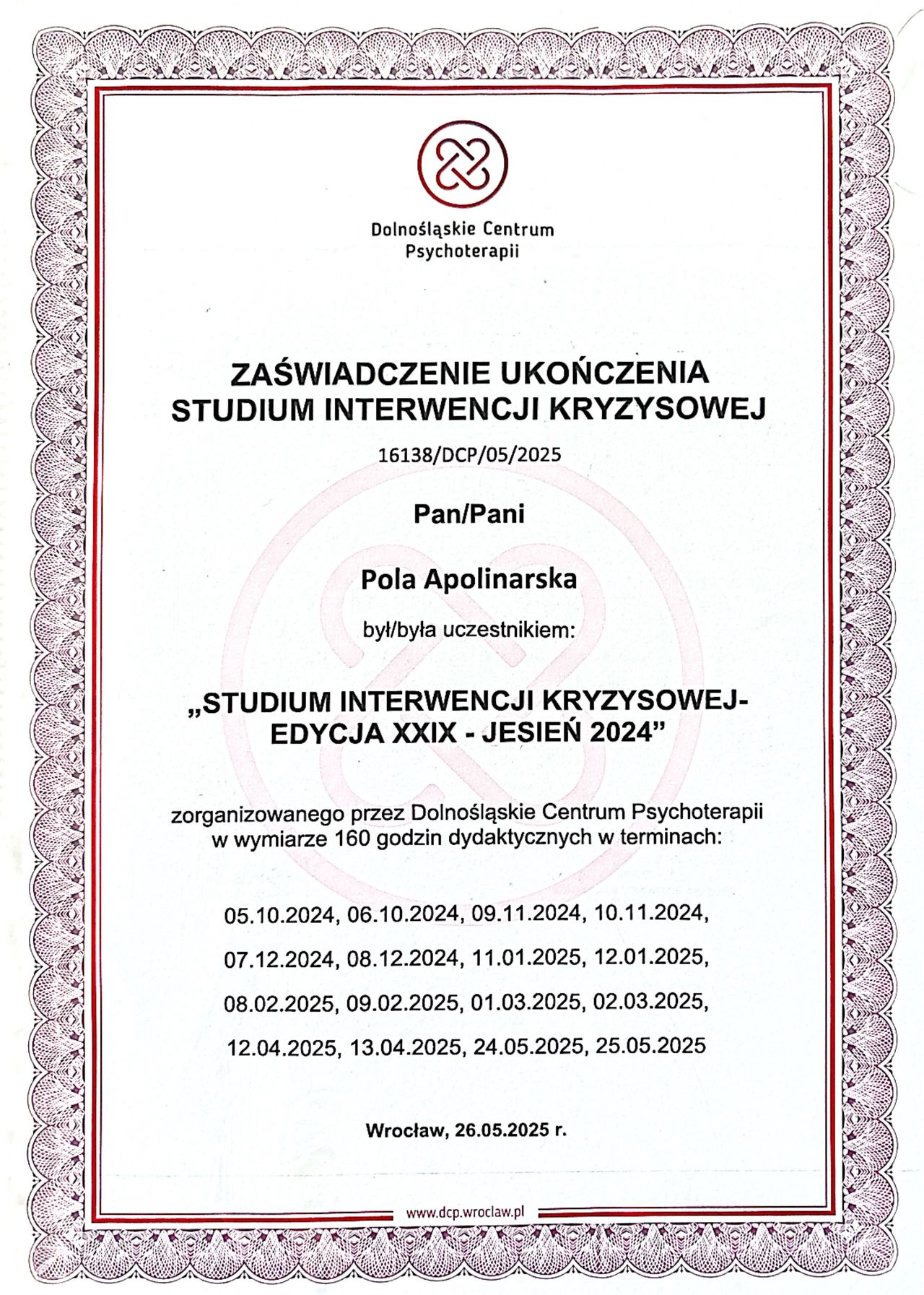 Ukończyłam roczny kurs interwencji kryzysowej, który wzbogacił moje kompetencje w pracy z osobami znajdującymi się w sytuacjach nagłego przeciążenia emocjonalnego. Obecnie jestem również w trakcie całościowego, czteroletniego szkolenia psychoterapeutycznego, co pozwala mi pogłębiać rozumienie mechanizmów psychicznych oraz wspierać Pacjentów w bardziej zintegrowany i długofalowy sposób.